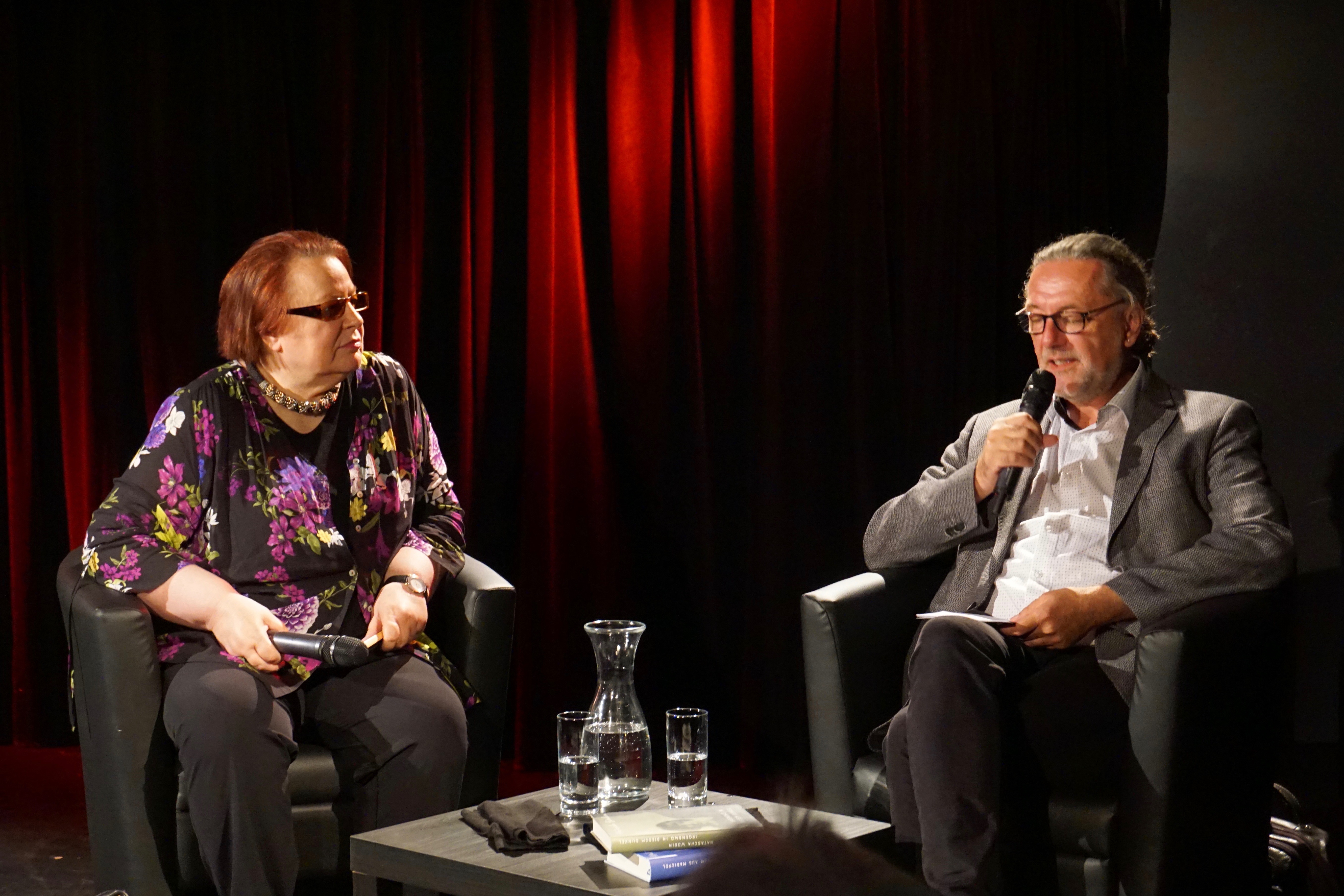 | Beschreibung | Natascha Wodin mit Moderator Dirk Kruse in ihrer Lesung bei LESEN! im Kulturforum Fürth am 28. Juni 2019 | ||