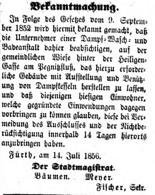 | Beschreibung | Geplante „Dampf-Wasch- und Badeanstalt“ an der Pegnitz, Juli 1856 | ||