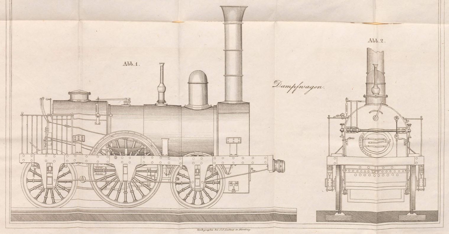 | Quellangaben | In: Georg Rebenstein: Stephenson's Locomotive auf der Ludwigs-Eisenbahn von Nürnberg nach Fürth in ihrer Ruhe und Thätigkeit dargestellt, Nürnberg 1836 - online-Digitalisat der Bayerischen Staatsbibliothek | ||