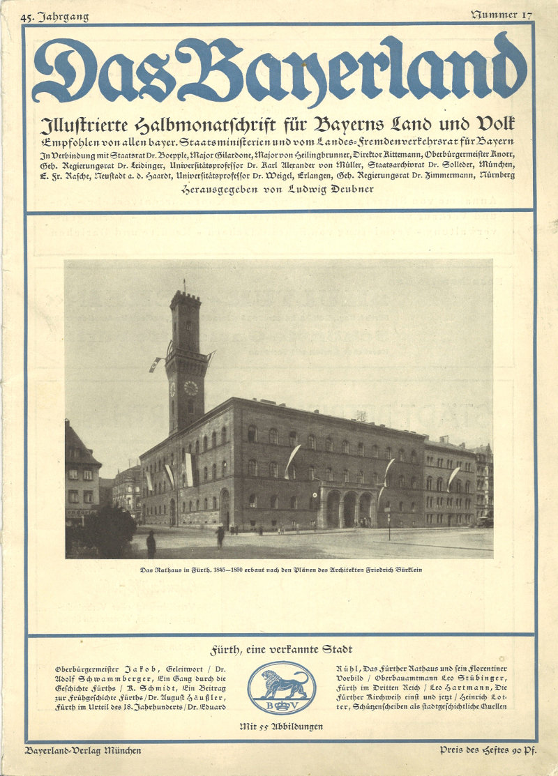 | Dateiinfo (Bild-Unterschrift und Info-Box, automatisch erstellt) | Das Bayerland, Ausgabe 17 / 1934 - Fürth, eine verkannte Stadt - Buchtitel Urheber: Adolf Schwammberger u. A.<br><br>Lizenz: CC BY-SA 3.0 | ||