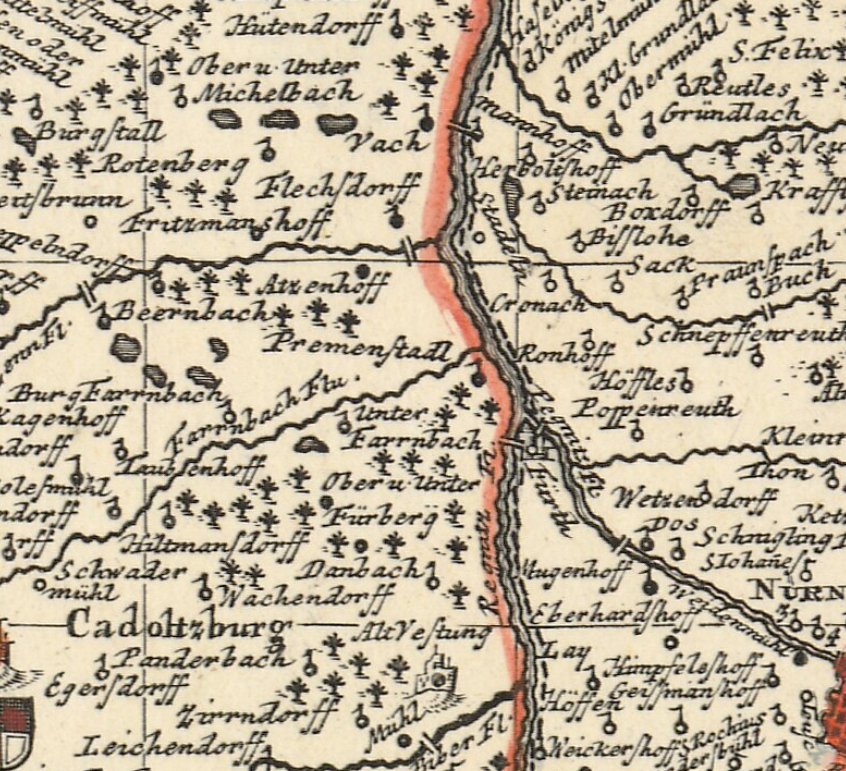 | Dateiinfo (Bild-Unterschrift und Info-Box, automatisch erstellt) | Ausschnitt aus: "Das Nürenbergische Gebiet", um 1730 Urheber: Christoph Scheurer<br><br>Lizenz: CC BY-NC-SA 4.0 | ||