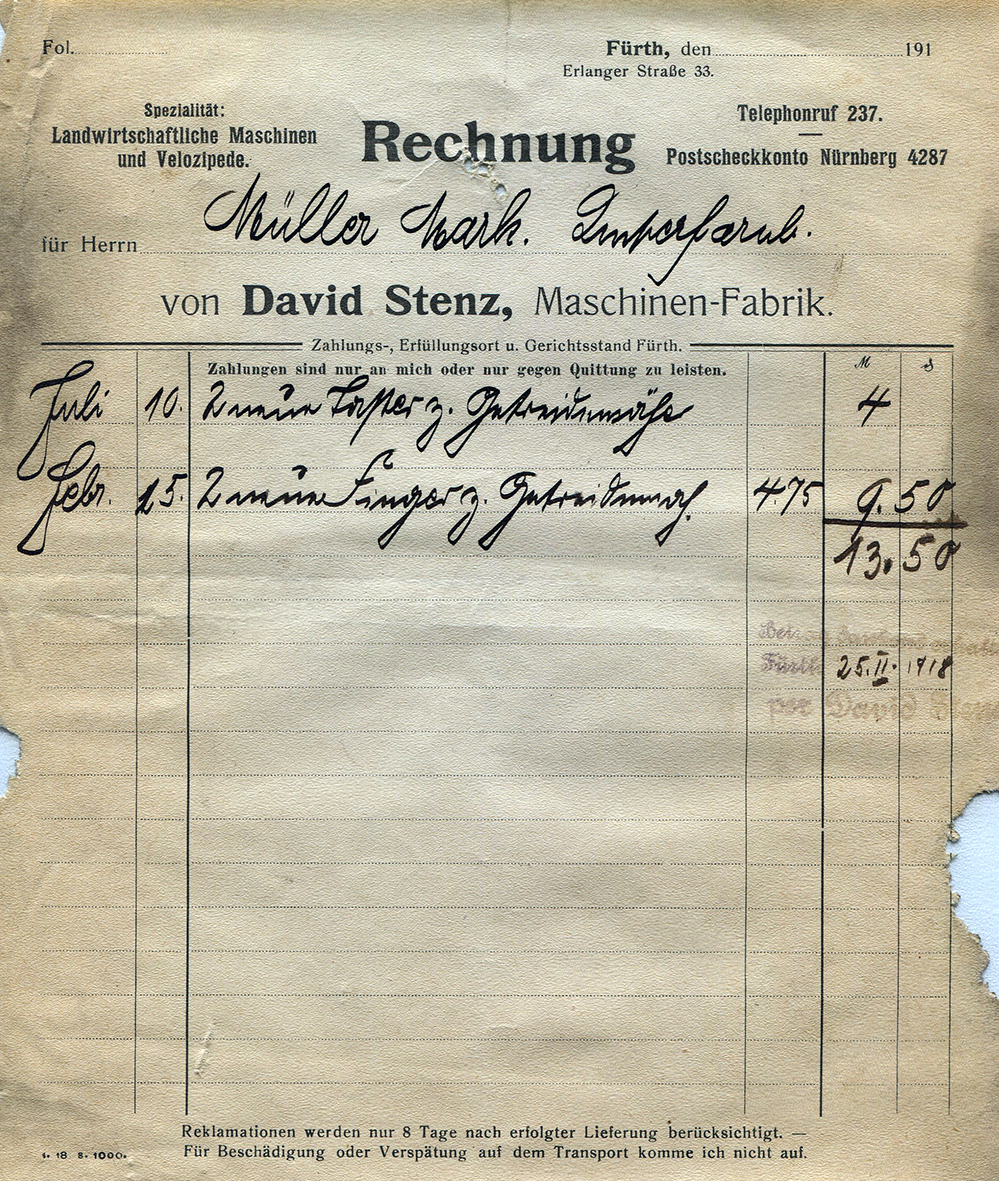 | Beschreibung | Rechnung David Stenz, Maschinen-Fabrik in der Erlanger Straße 33, Feb. 1918 | ||