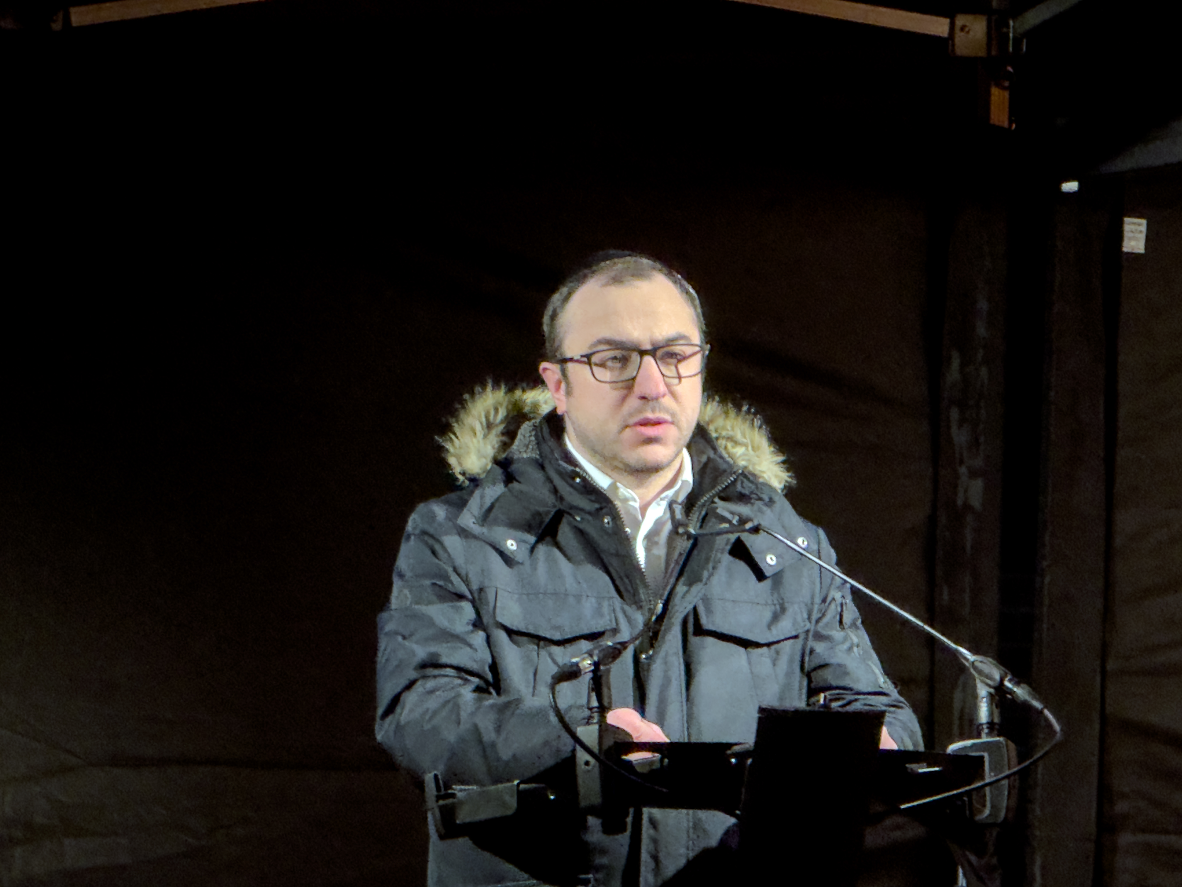 | Beschreibung | Rabbiner David Zharko an der Gedenkveranstaltung zur Pogromnacht am Synagogenplatz, Nov. 2025 | ||