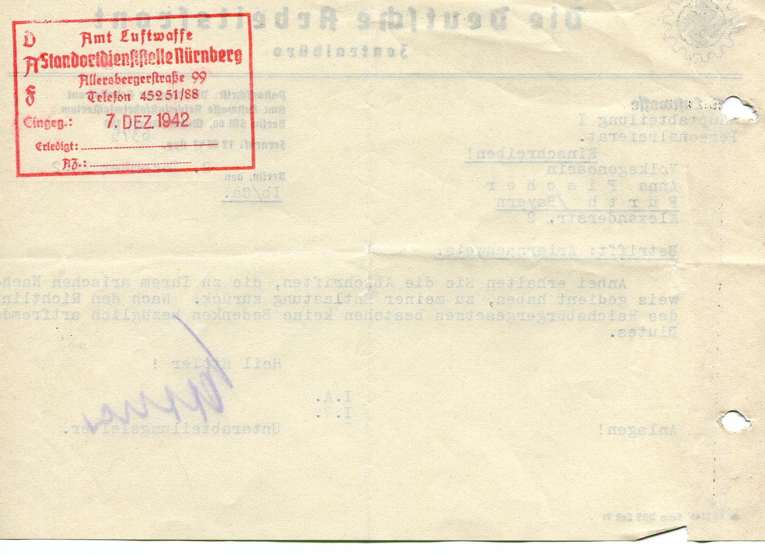Deutsche Arbeitsfront Berlin 1942 Bescheid zum Ariernachweis - "keine Bedenken bezüglich artfremden Blutes". RÜCKSEITE Stempel DAF Nürnberg