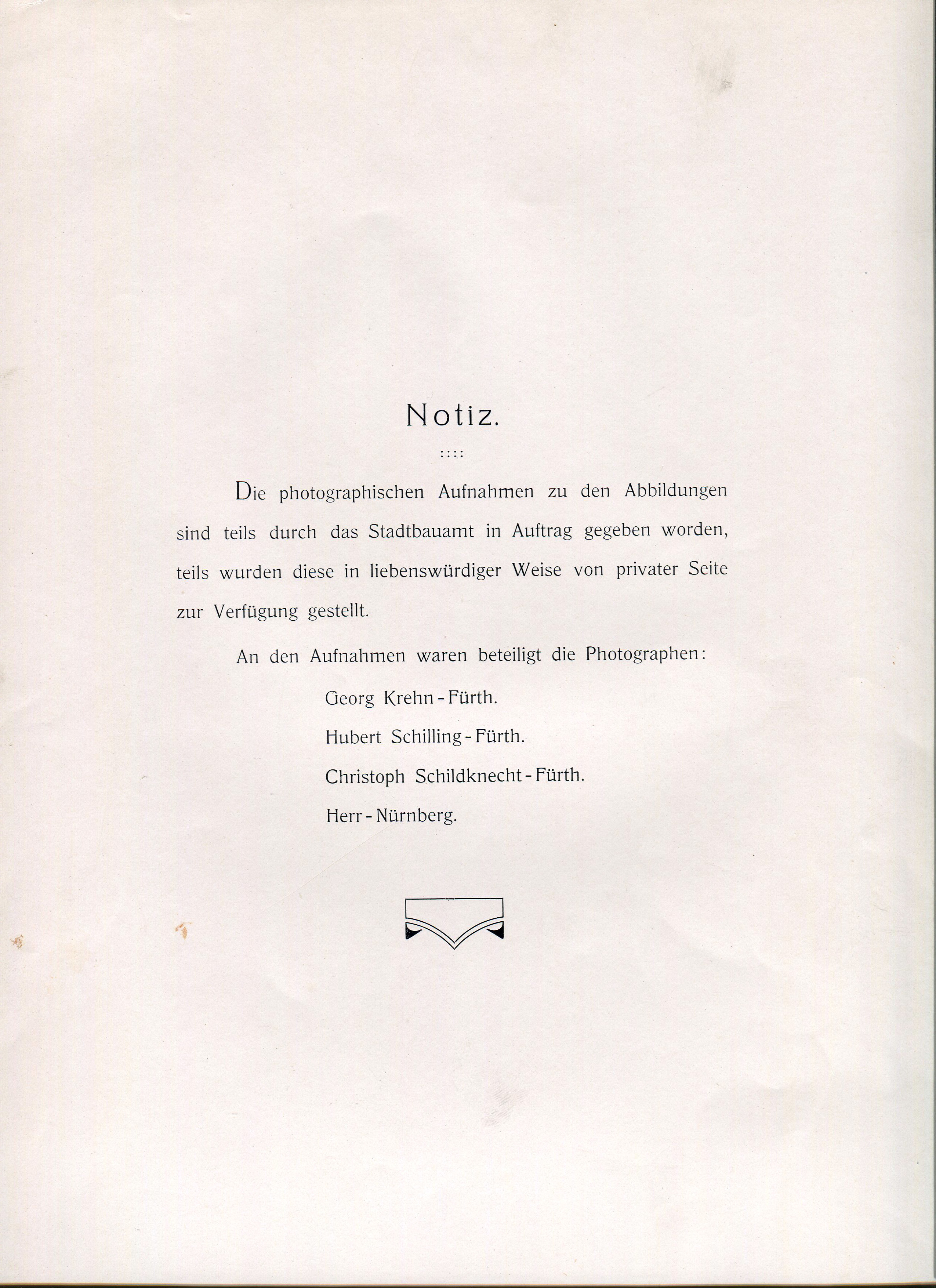 | Beschreibung | Seite aus der Bildermappe Die Stadt Fürth mit dem Hinweis, wer die Fotografen der Bildermappe waren. | ||