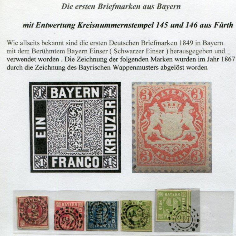 | Beschreibung | Verschiedene Kreuzer-Marken des Königreichs Bayern aus der Zeit von 1849 - 1867 mit sog. offenem Mühlradstempel bzw. Kreisnummernstempel, Nr. 145 für Fürth | ||