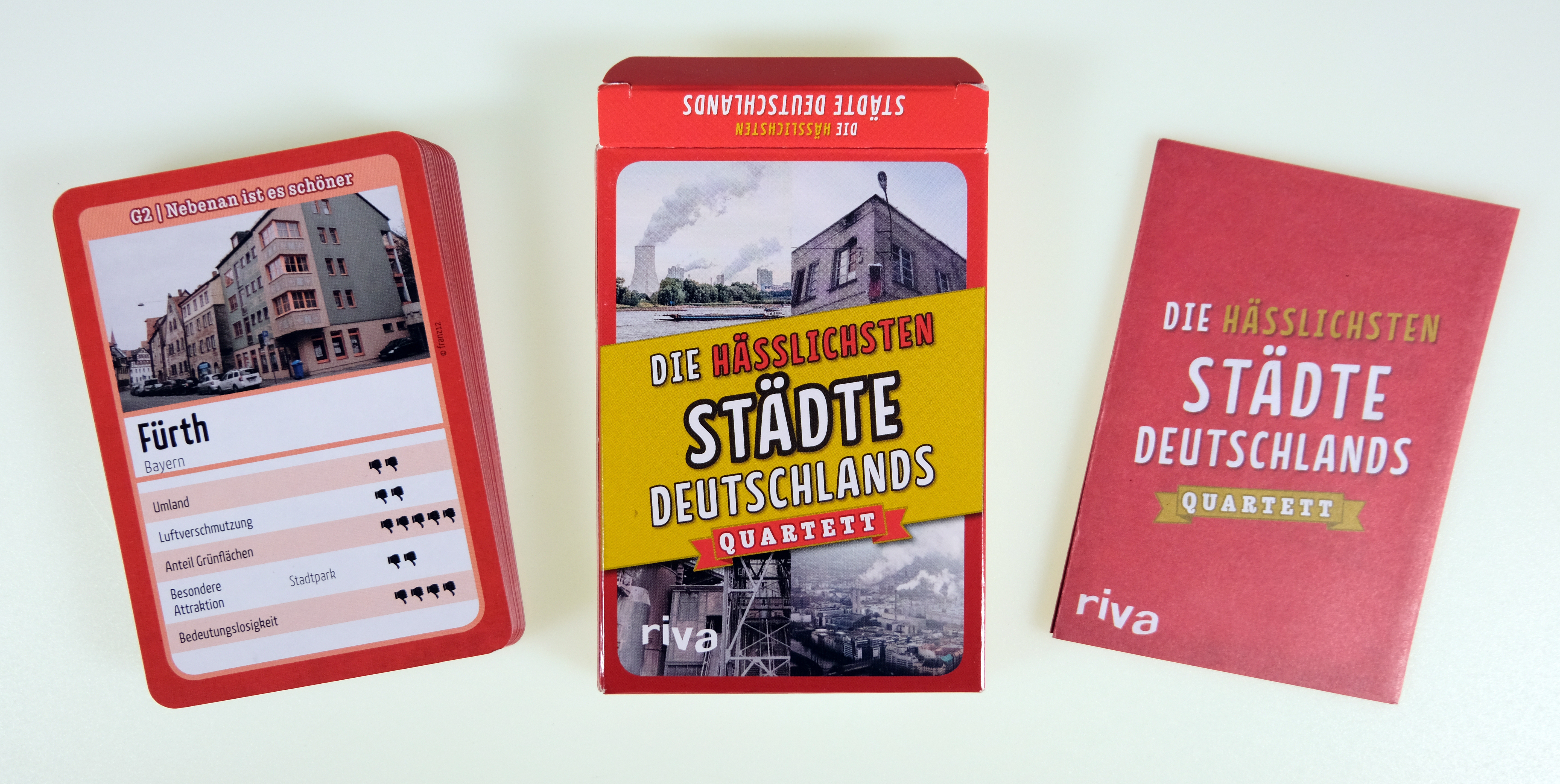 | Dateiinfo (Bild-Unterschrift und Info-Box, automatisch erstellt) | Die hässlichsten Städte Deutschlands (Quartett), 2018 Urheber: Riva Verlag<br><br><br>Lizenz: copyright | ||