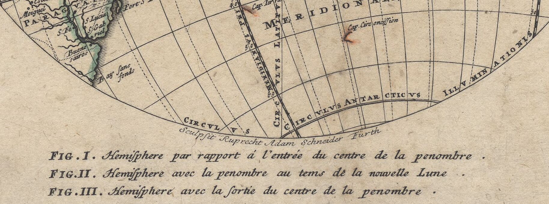 | Beschreibung | Ausschnit aus: "Die verfinsterte Erdkugel d.i. geographische Vorstellung der Sonnen- od. Erd-Finsternis den 25.ten Iuli Ao. 1748" von Georg Moriz Lowitz (Kupferstecher "Ruprecht Adam Schneider Fürth") | ||
