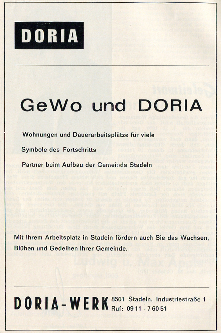 | Beschreibung | Werbeanzeige Doria Werke ehem. in Stadeln, ca. 1970 | ||