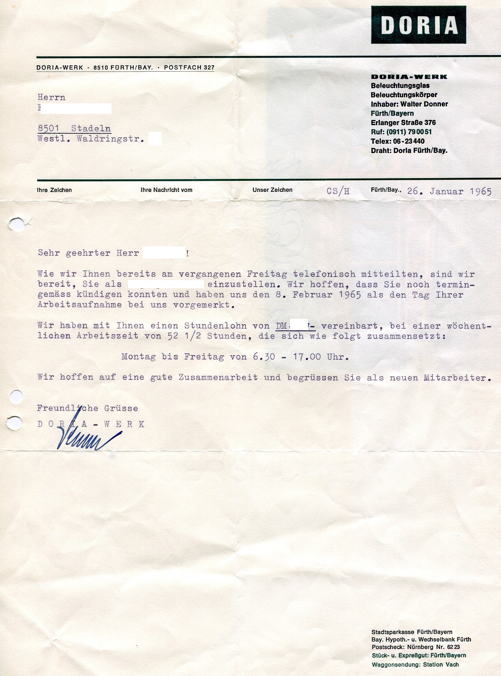 | Beschreibung | Doria Werke Stadeln 1965 Schriftverkehr mit früherer Straßenbezeichnung | ||