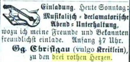 | Beschreibung | Zeitungsanzeige des Wirts "zu den drei rothen Herzen", Gg. Christgau, Februar 1870 | ||