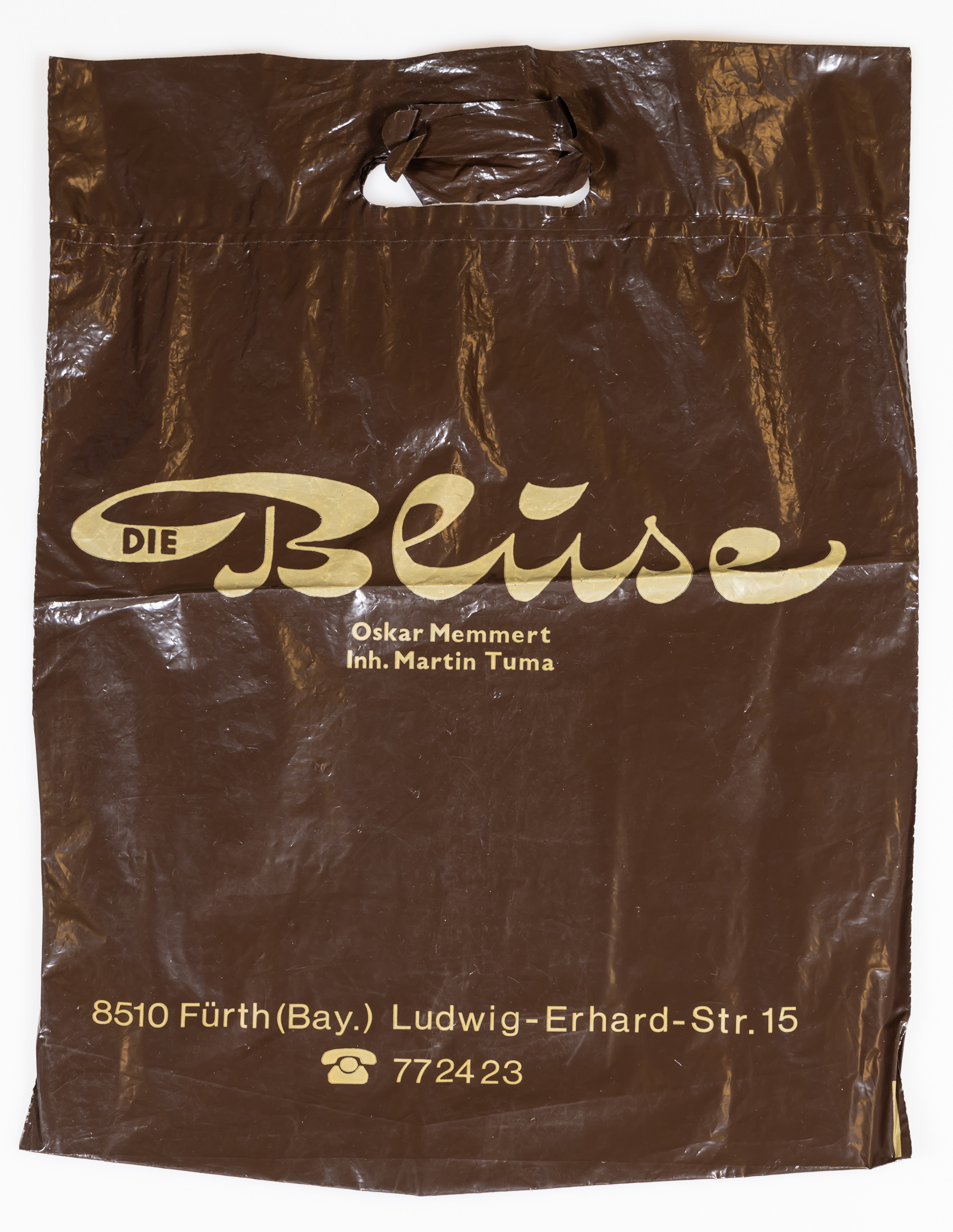 | Beschreibung | Einkaufs-/Plastiktüte des ehemaligen Modegeschäftes Die Bluse | ||