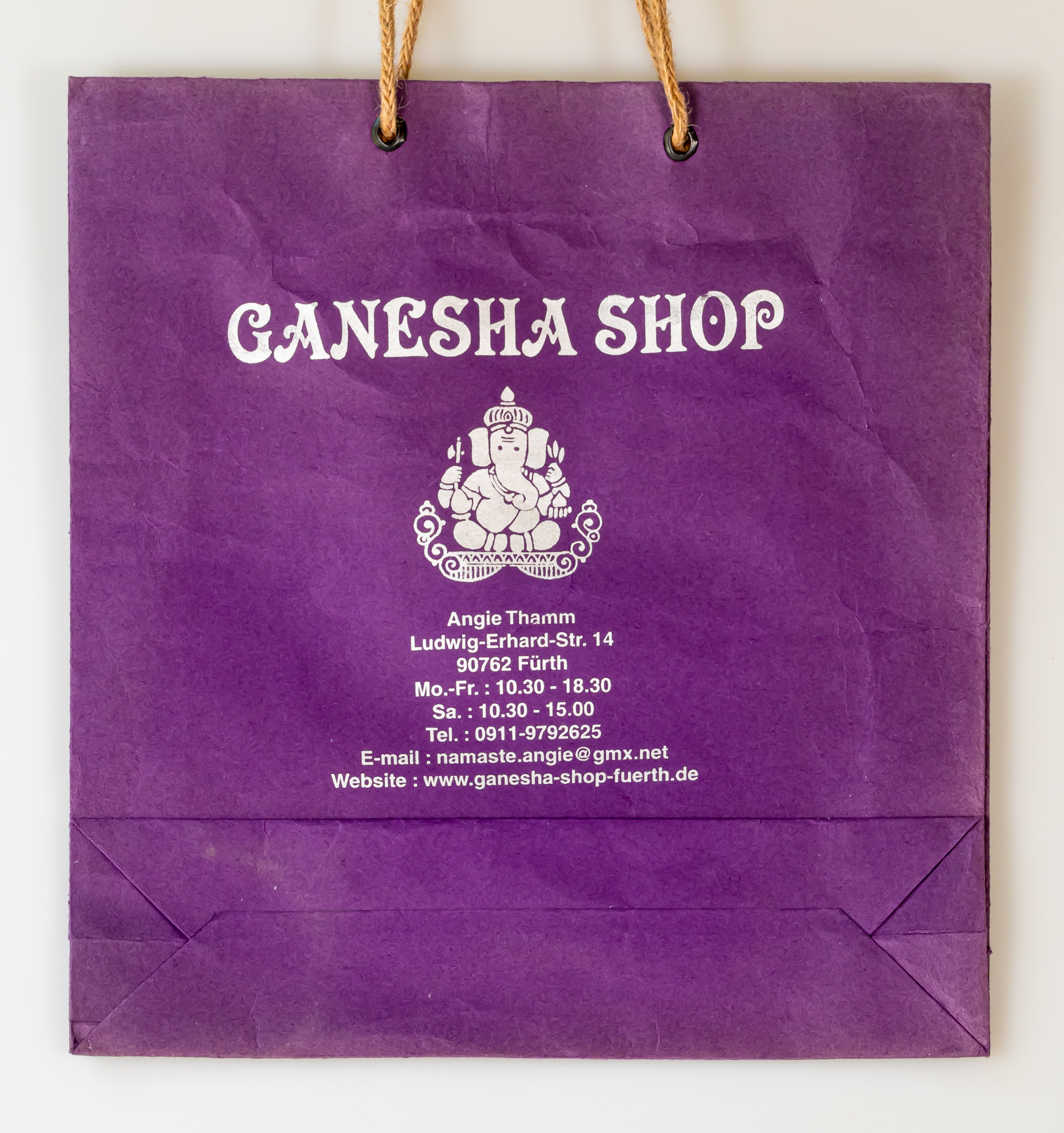 | Beschreibung | Einkaufs-/Plastiktüte der Firma Ganesha Shop, Ludwig-Erhard-Straße 14 | ||