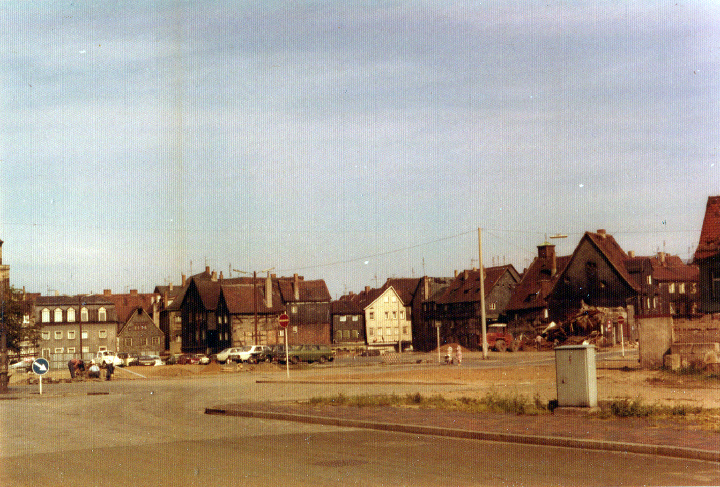 | Beschreibung | Am Löwenplatz nach dem Abriss der meisten Häuser, 1974. Zur Orientierung hilft das Türmchen des Roten Roßes im Hintergrund | ||