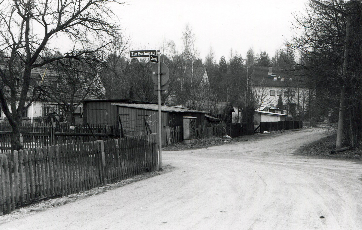 | Beschreibung | Ehem. Wohnsiedlung in der Eschenau vor dem Abriss, ca. 1988. Entensteig mit Einmündung Zur Eschenau | ||
