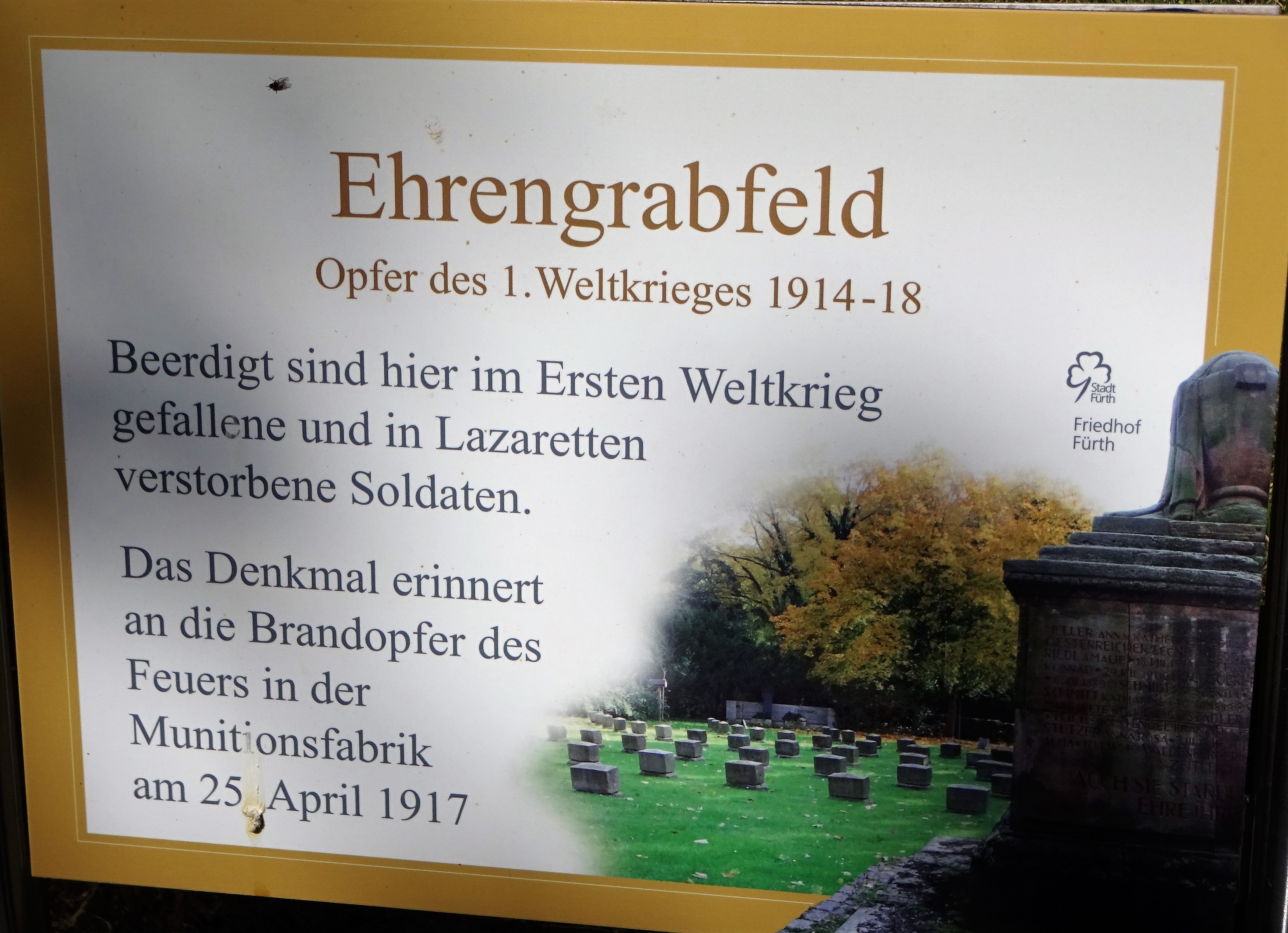 | Dateiinfo (Bild-Unterschrift und Info-Box, automatisch erstellt) | Tafel am Ehrengrabfeld für die Opfer des Ersten Weltkriegs auf dem Hauptfriedhof, Mai 2020 Urheber: Norbert Pietsch<br><br>Lizenz: CC BY-SA 3.0 | ||
