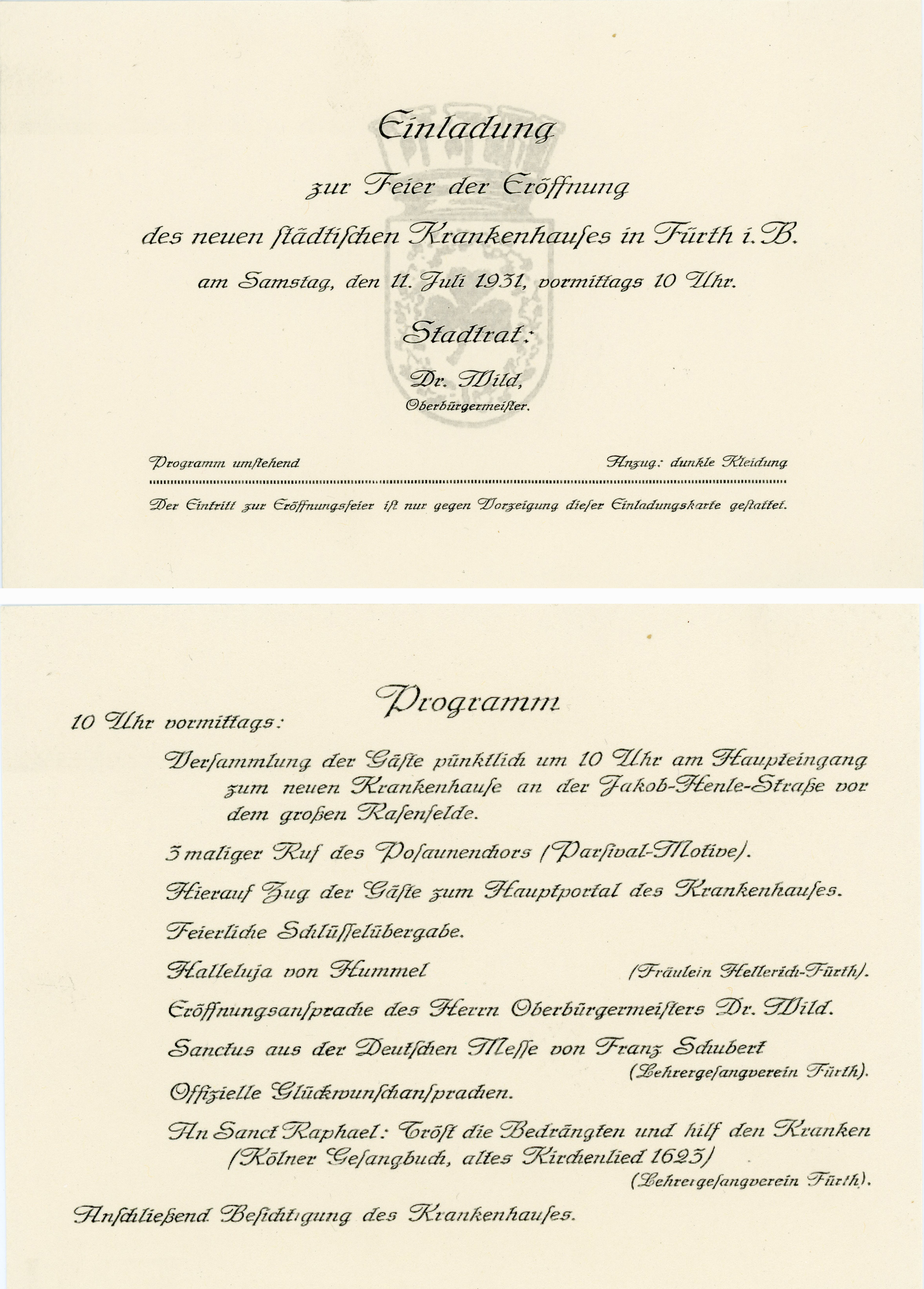| Dateiinfo (Bild-Unterschrift und Info-Box, automatisch erstellt) | Einladung zur feierlichen Eröffnung des neuen Stadtkrankenhauses im Juli 1931 Urheber: Klinikum Fürth<br><br>Lizenz: CC BY-SA 3.0 | ||