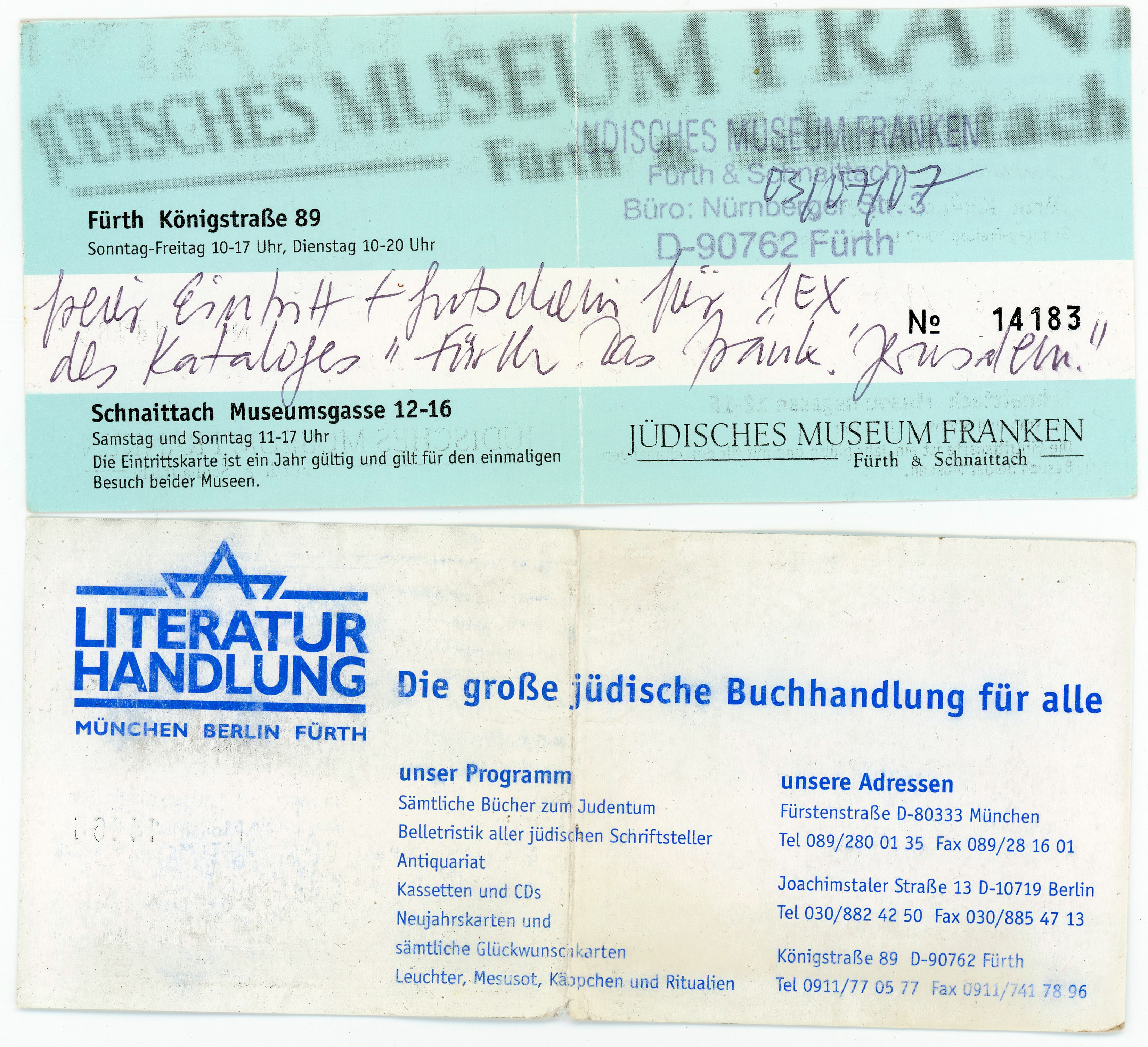 | Dateiinfo (Bild-Unterschrift und Info-Box, automatisch erstellt) | Eintrittskarte zum Jüdischen Museum Franken, Juli 2007 Urheber: Jüdisches Museum Franken<br><br>Lizenz: CC BY-SA 3.0 | ||