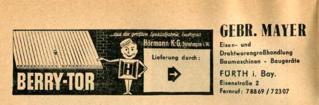 | Beschreibung | 1965: zeitgenössische Werbung der Firma Gebr. Mayer in der Eisenstraße 2 | ||