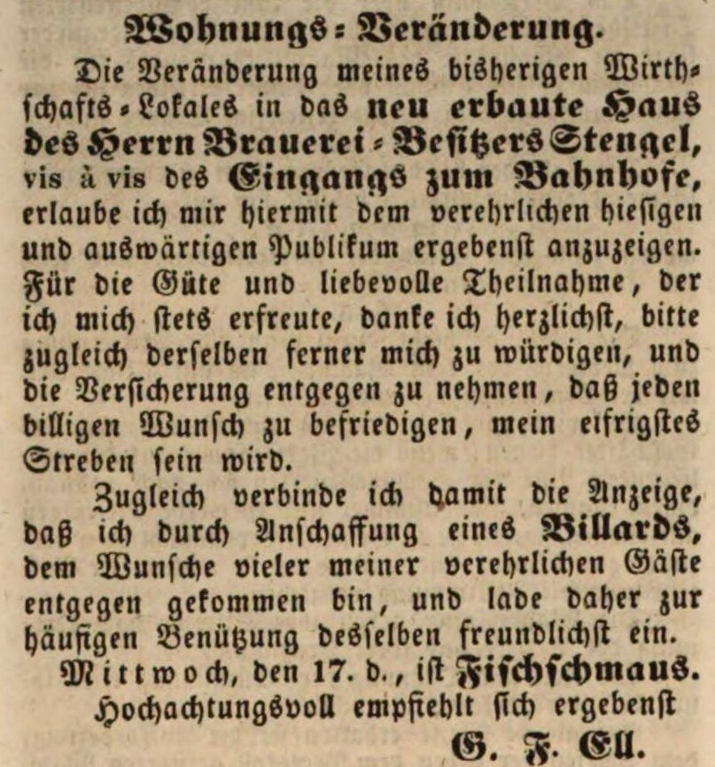 | Beschreibung | Zeitungsannonce des Wirts G. F. Ell, der seine Wirtschaft in das neuerbaute Stengel'sche Haus am Bahnhof verlegte, September 1845 | ||