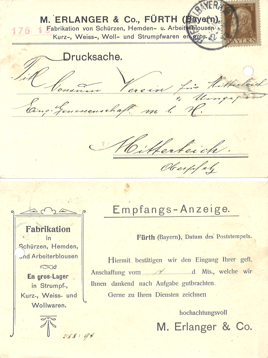 | Beschreibung | Empfangs-Anzeige (Auftragsbestätigung) der Fa. M. Erlanger von 1913 | ||