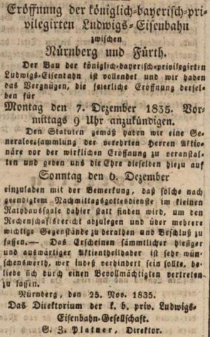 | Beschreibung | Einladung zur Eröffnung der Ludwigseisenbahn, November 1835 | ||