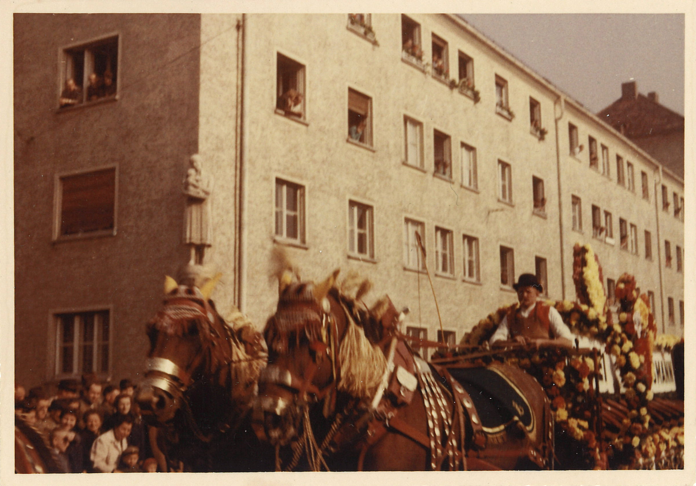 | Beschreibung | Erntedankfestzug in der Flößaustraße bei Einmündung Buschingstraße, 1955. Festgespann der Brauerei Geismann | ||