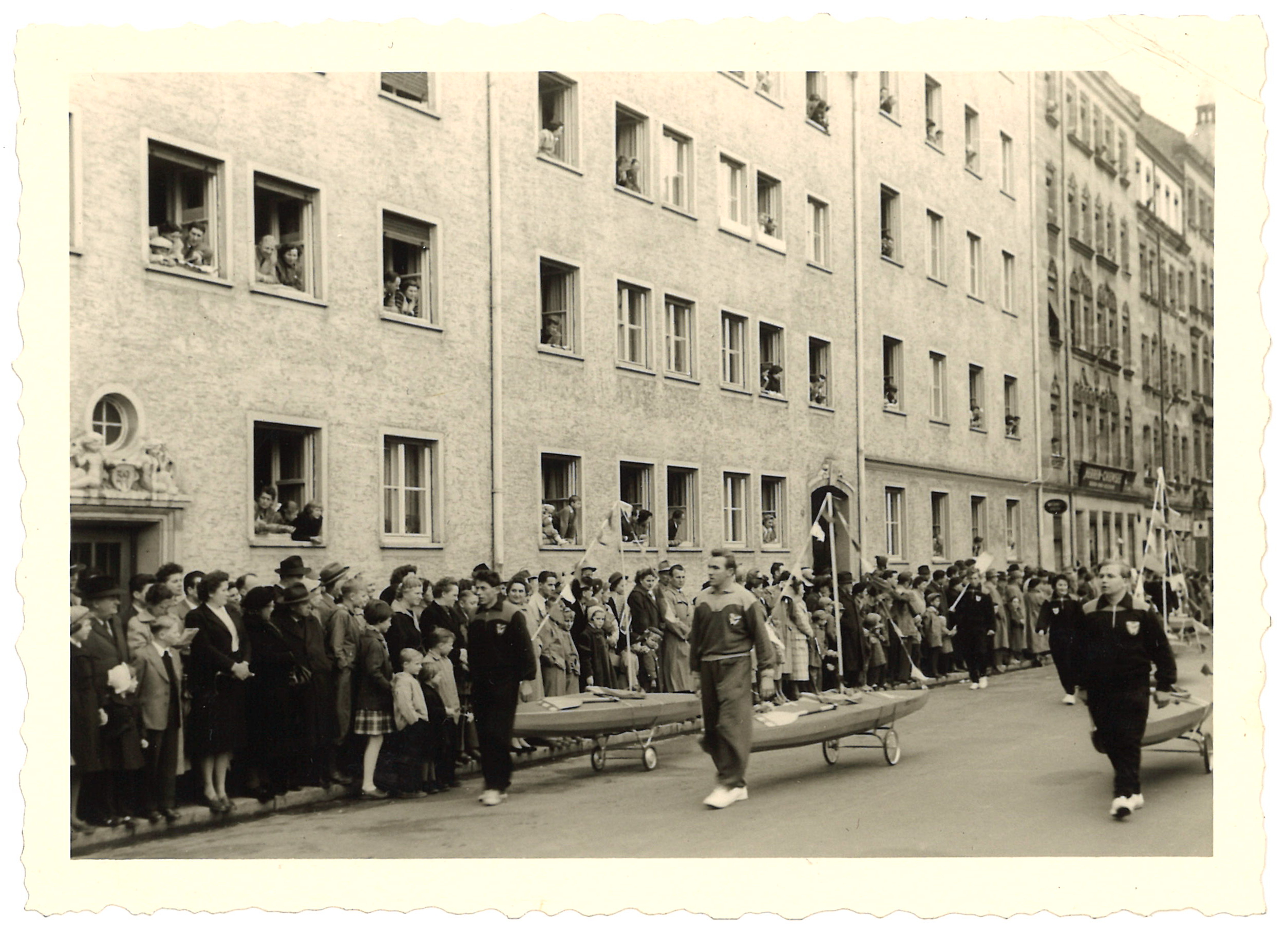 | Beschreibung | Erntedankfestzug in der Flößaustraße auf Höhe Nr. 39, 1956. Kanuabteilung des späteren SG Nürnberg Fürth 1883 | ||