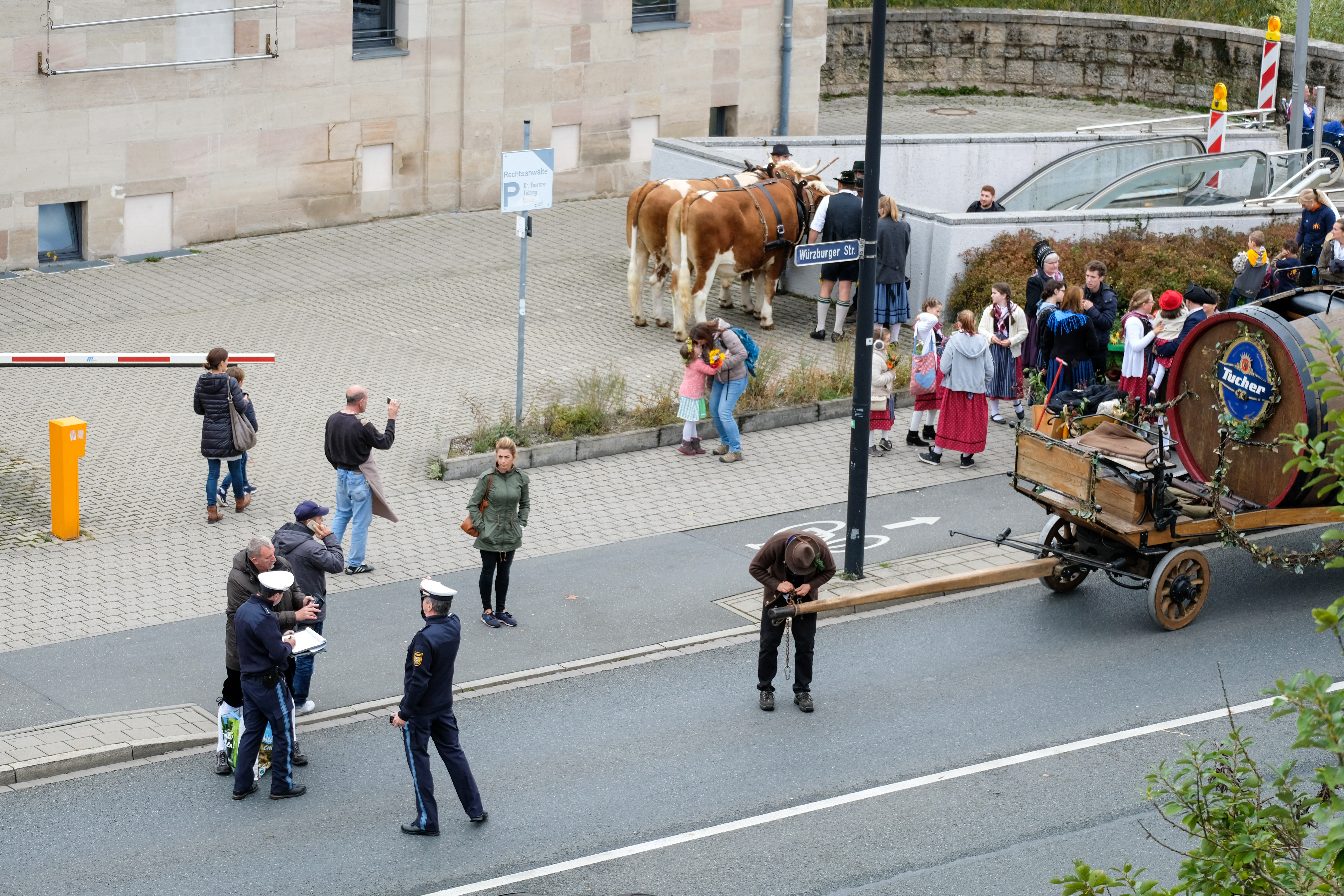 | Beschreibung | Polizeiliche Ermittlungsarbeiten nach dem Unfall am Festzug mit dem Ochsenwagen der Brauerei Tucher - Erntedankfestzug, Okt 2017 | ||