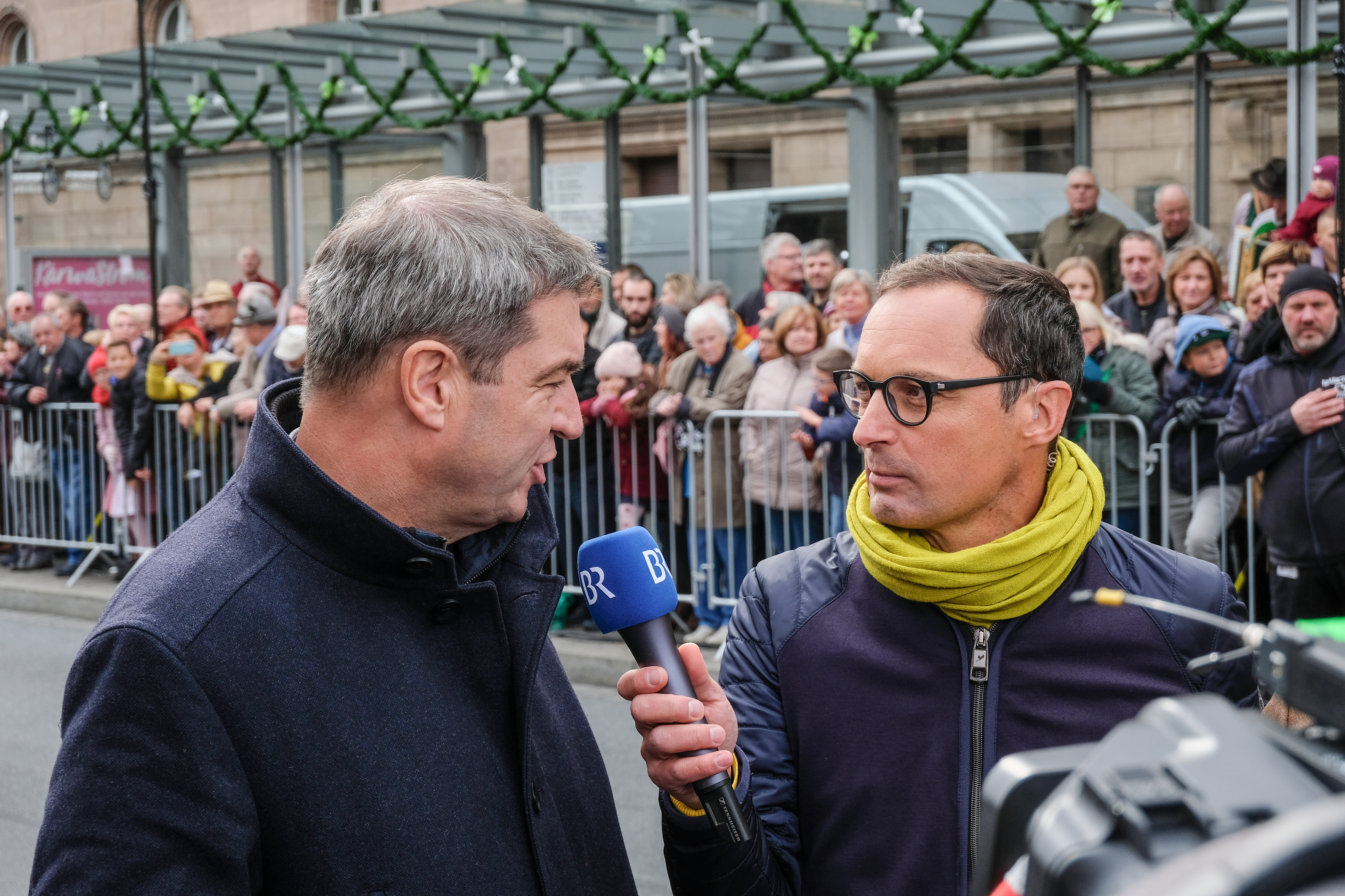 | Beschreibung | Markus Söder im Gespräch mit dem BR am Erntedankfestzug zur Fürther Kärwa, Okt. 2019 | ||