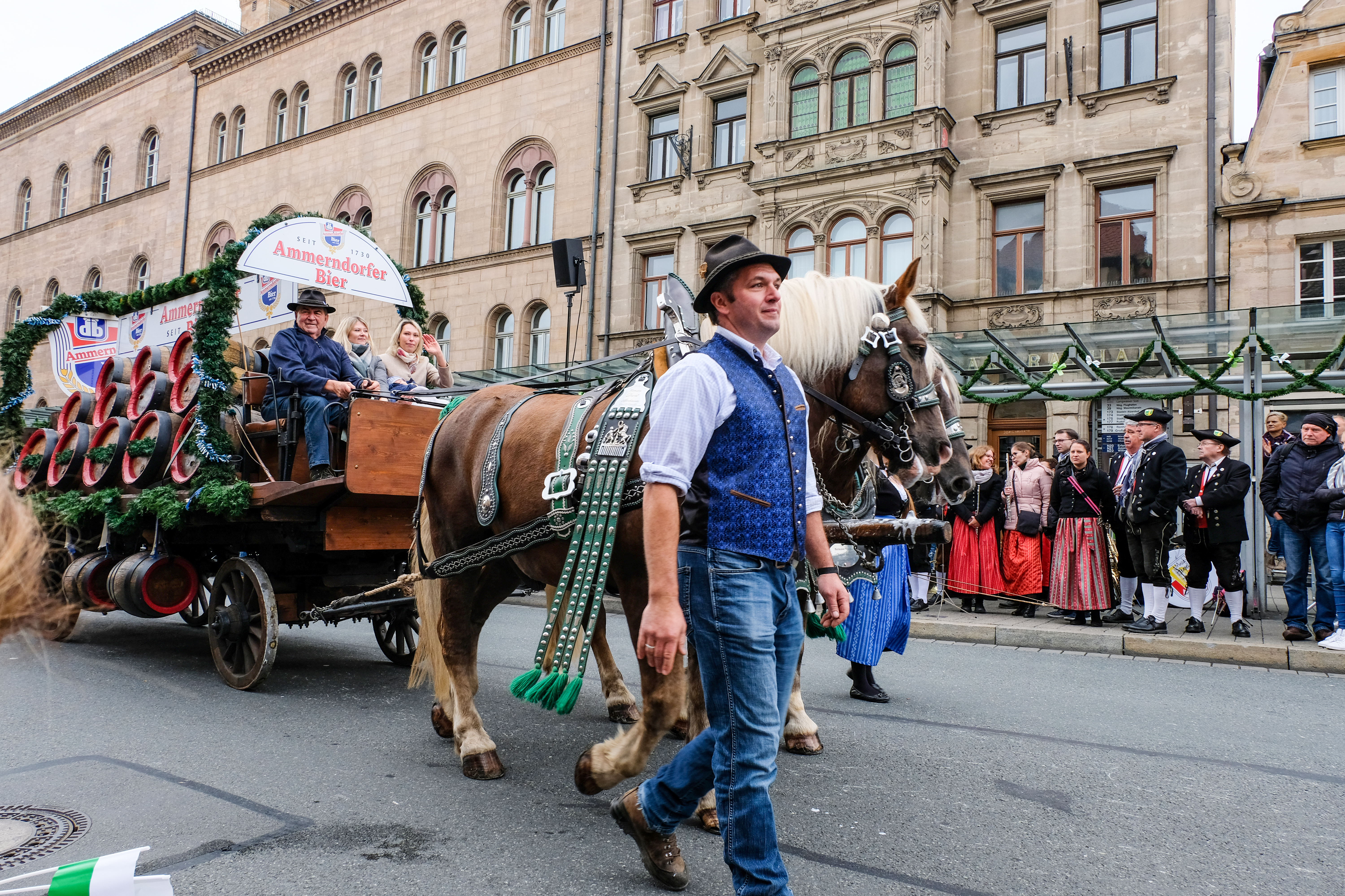 | Beschreibung | Fuhrwagen der Brauerei Ammerndorf mit den Braumeister:innen am Erntedankfestzug zur Fürther Kärwa, Okt. 2019 | ||