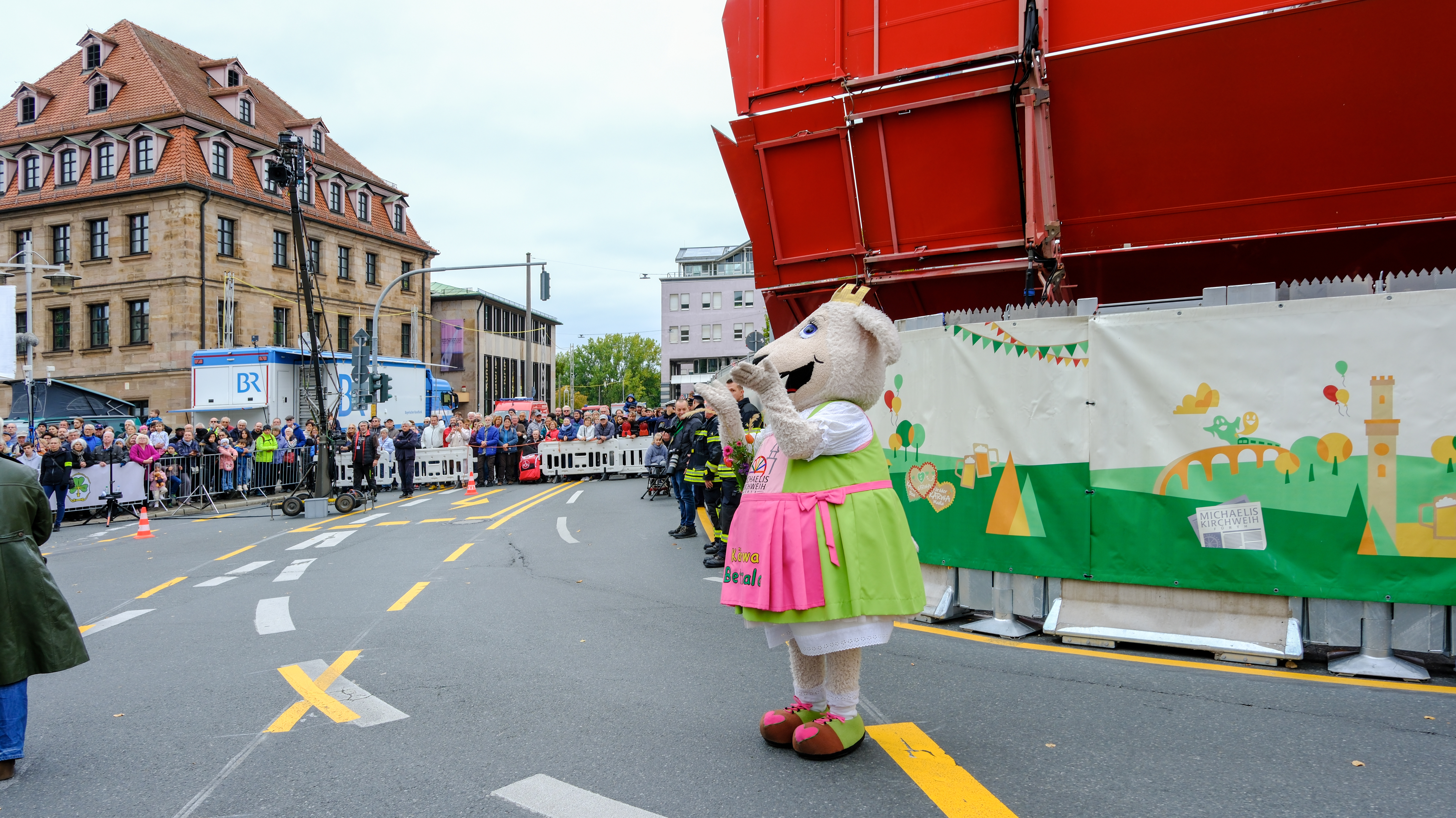| Beschreibung | Erntedankfestzug - Aufstellung und Ablauf des Zuges aus der Südstadt zur Innenstadt, hier im Bild das Maskottchen Betzala und im Hintergrund das Kamerateam des Bay. Fernsehen, Okt. 2025 | ||