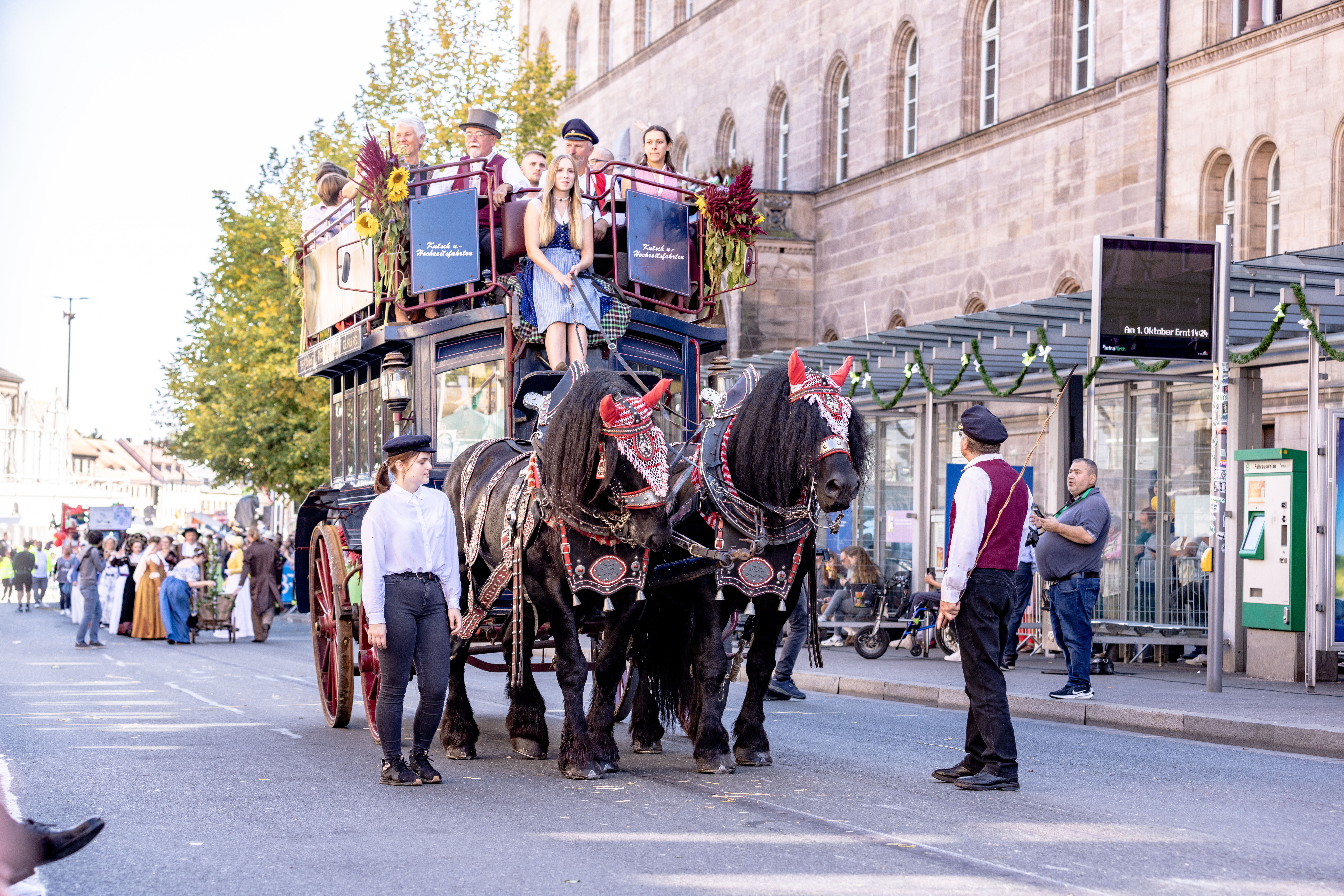 | Beschreibung | Erntedankfestzug 2023 - Pferdefreunde Franken - Markt Erlbach, Fürther Straßenbahnwagen anno 1900 mit Ponykutsche, Okt. 2023 | ||