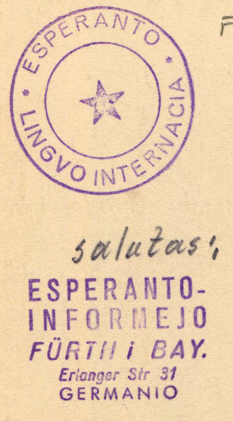 | Dateiinfo (Bild-Unterschrift und Info-Box, automatisch erstellt) | Postkarte mit einem Stempel einer Esperanto-Gruppe aus Fürth, undatiert Lizenz: CC BY-SA 3.0 | ||
