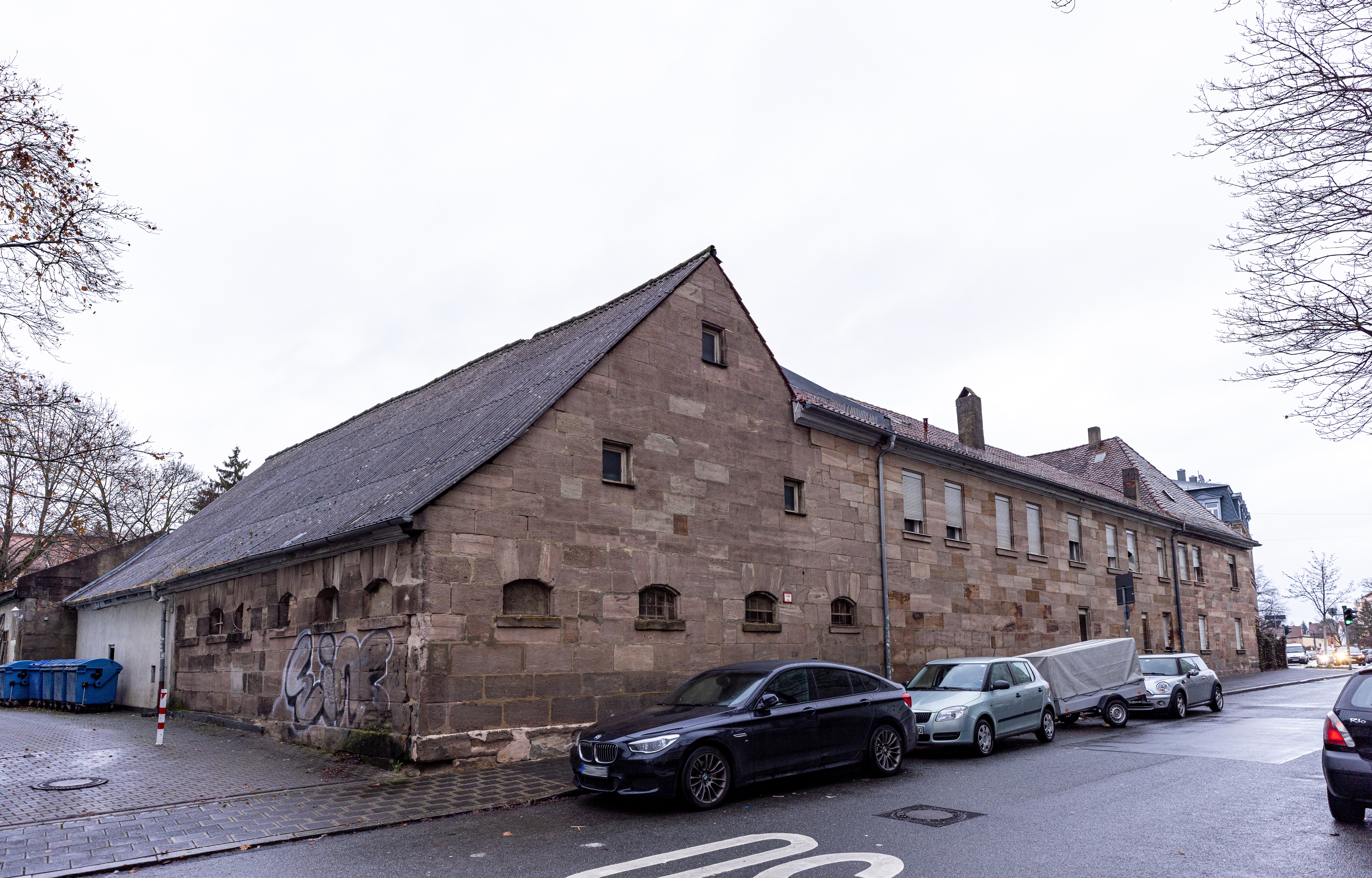| Beschreibung | Der 1851 errichtete Ochsenstadel in der Alten Reutstraße, dazwischen der 1860 erbaute Zwischenbau für Kutschen und Fahrzeuge, darüber die Wohnungen für das Personal, im Hintergrund das Hauptgebäude aus dem Jahr 1827, Dez. 2021 | ||