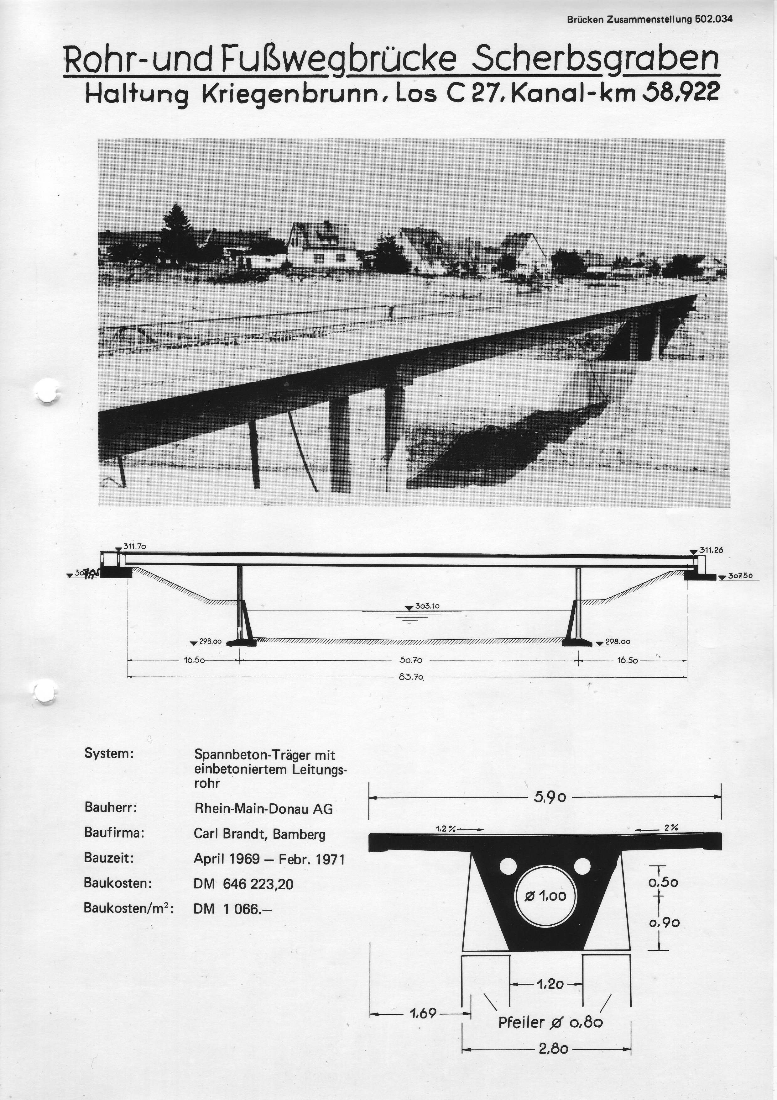 Übersichtsdatenblatt der Rhein-Main-Donau AG für den Fürberger Steg mit der damaligen Baubenennung "Rohr- und Fußwegbrücke Scherbsgraben; Haltung Kriegenbrunn, Los C 27, Kanal-km 58,922" (heute Main-Donau-Kanal-km 58,674)