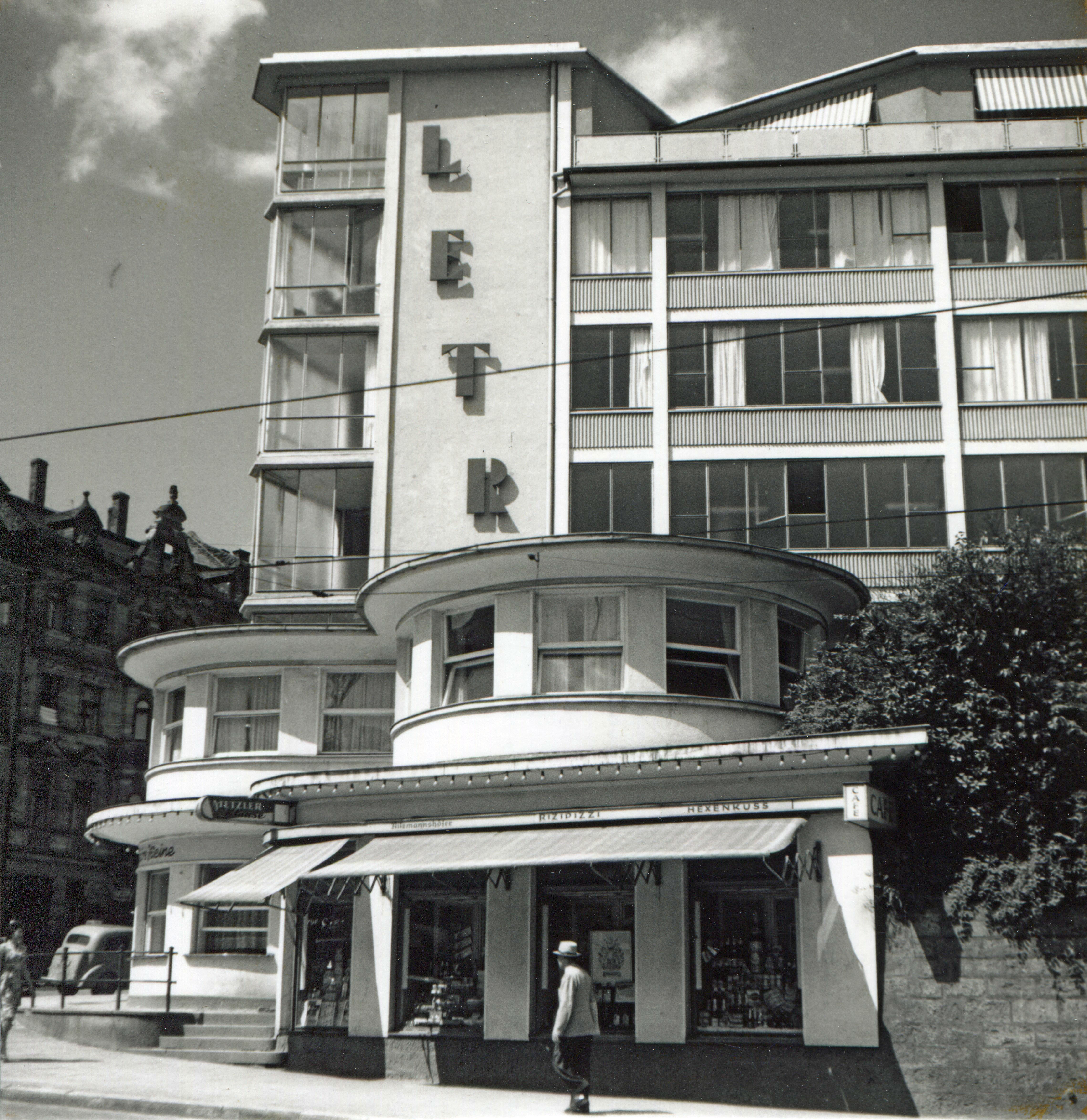 | Beschreibung | Das alte Café Fenstergucker mit der Eissorte "Hexenkuss", im Hintergrund das Letra-Haus, ca. 1960 | ||