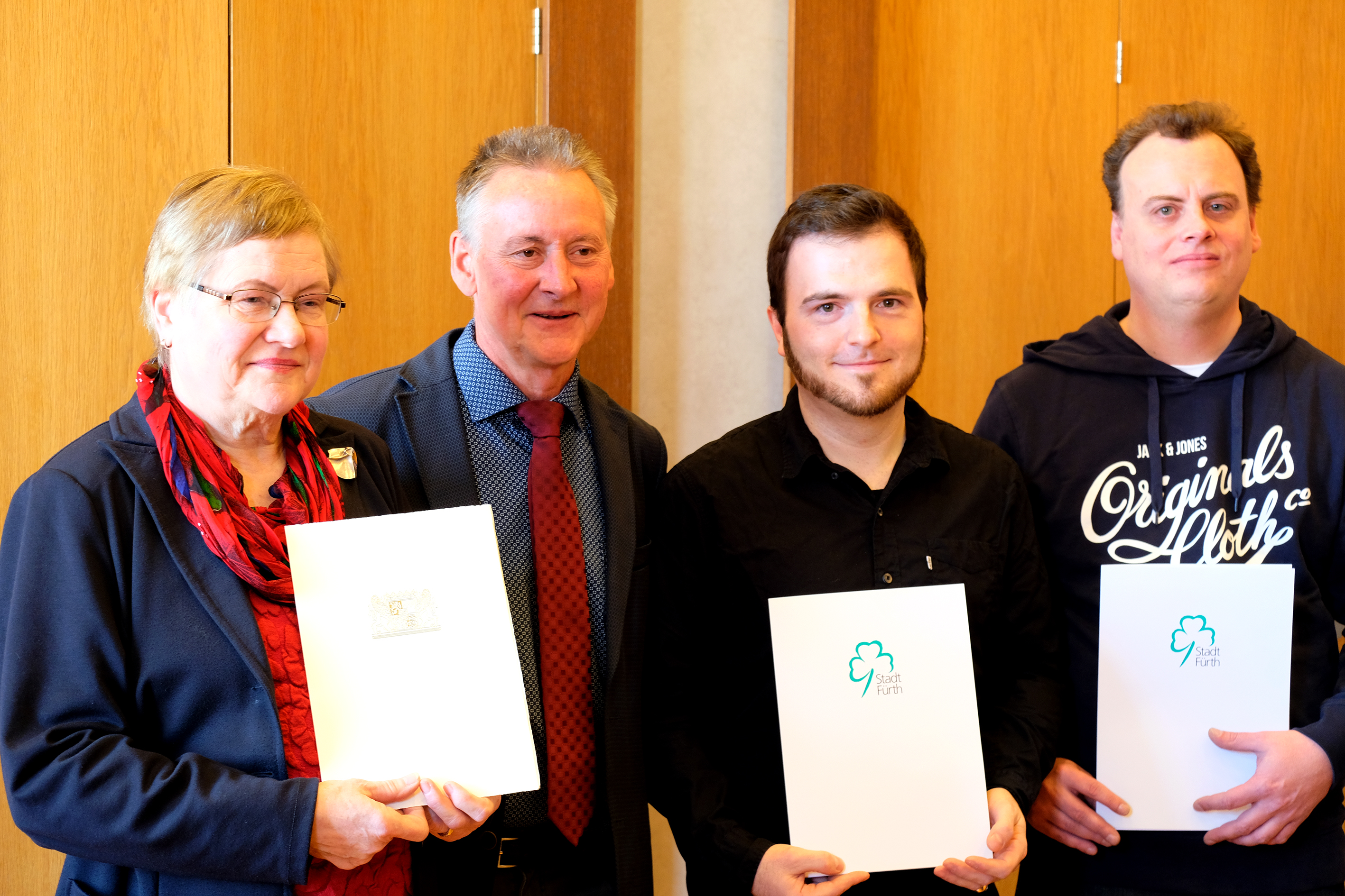 | Beschreibung | Die FürthWiki-Gründer Felix Geismann und Mark Muzenhardt bei der Ehrenbriefübergabe durch die Stadt Fürth, vertreten durch Oberbürgermeister Dr. Thomas Jung. Mit im Bild ist Hildegard Scharvogel die mit dem Ehrenzeichen des Bayerischen Ministerpräsidenten geehrt wurde. | ||