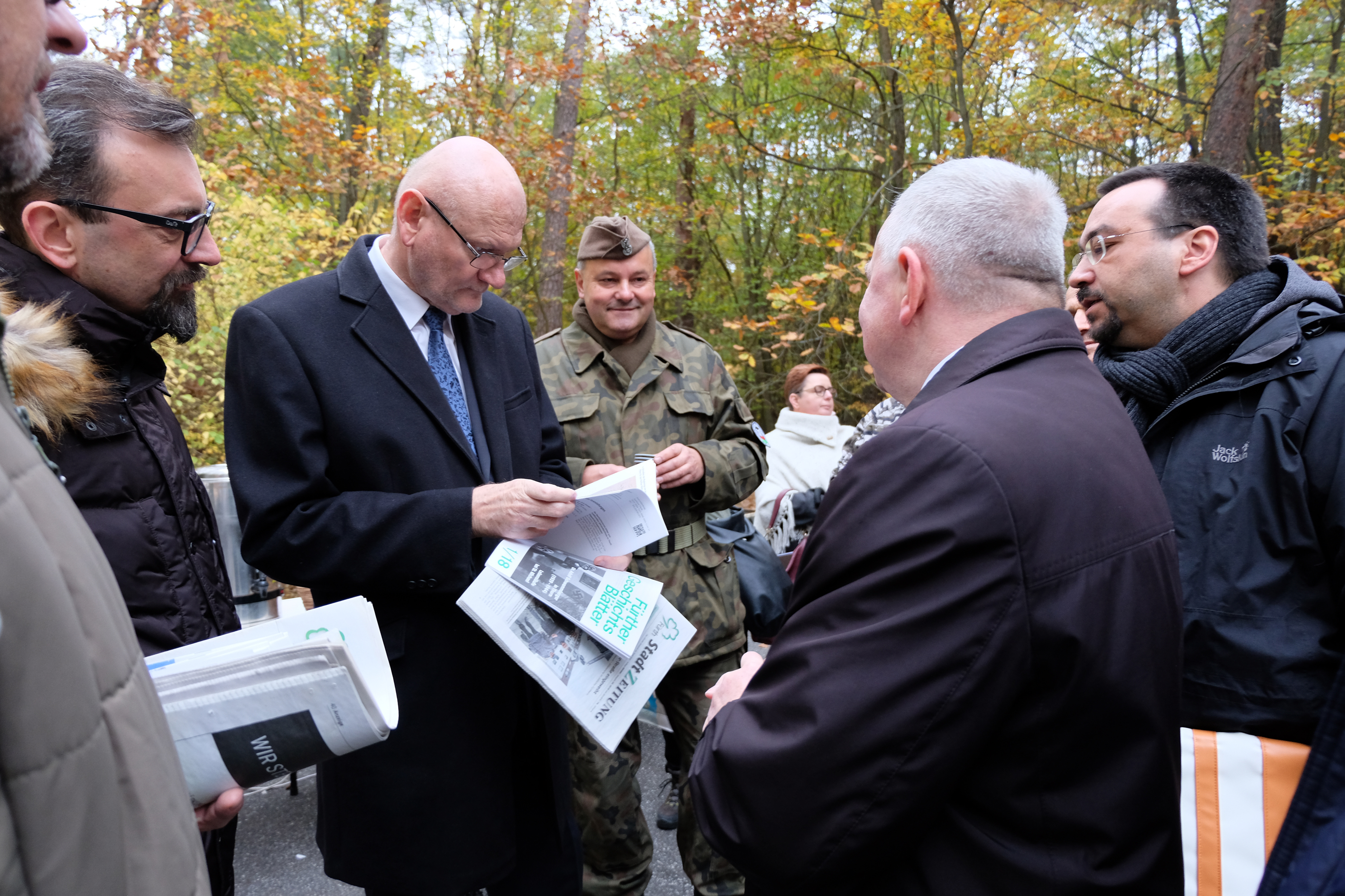 | Beschreibung | Der Toruńer Oberbürgermeister Michał Zaleski bei der Gedenkveranstaltung für die ermordeten Polen und Juden im ehem. Thorn im Gespräch mit der Fürther Delegation, Okt. 2018 | ||