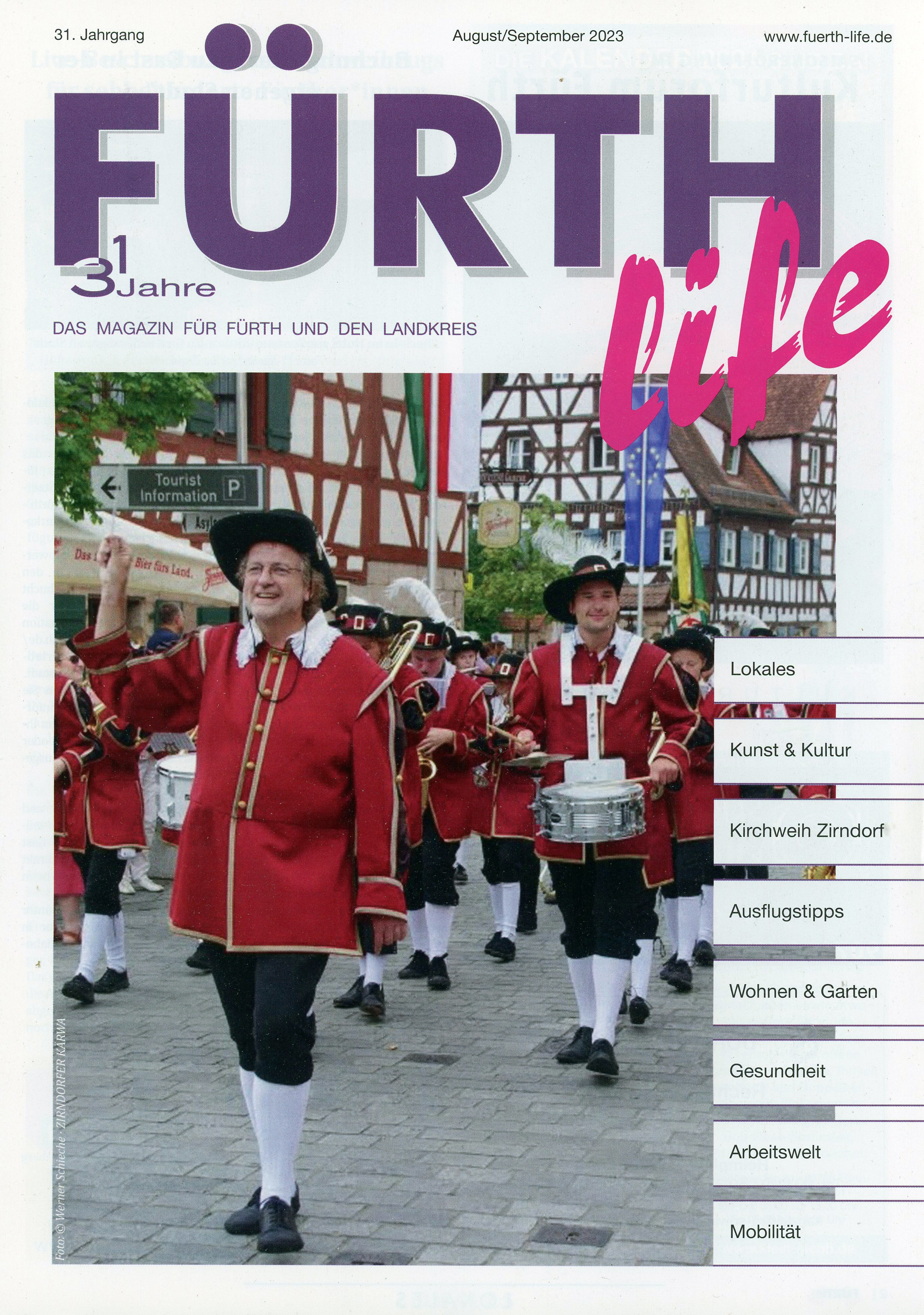 | Dateiinfo (Bild-Unterschrift und Info-Box, automatisch erstellt) | Titelseite: Fürth live Magazin, Ausgabe August/September 2023, 31. Jahrgang Urheber: Fürth life<br><br>Lizenz: copyright | ||