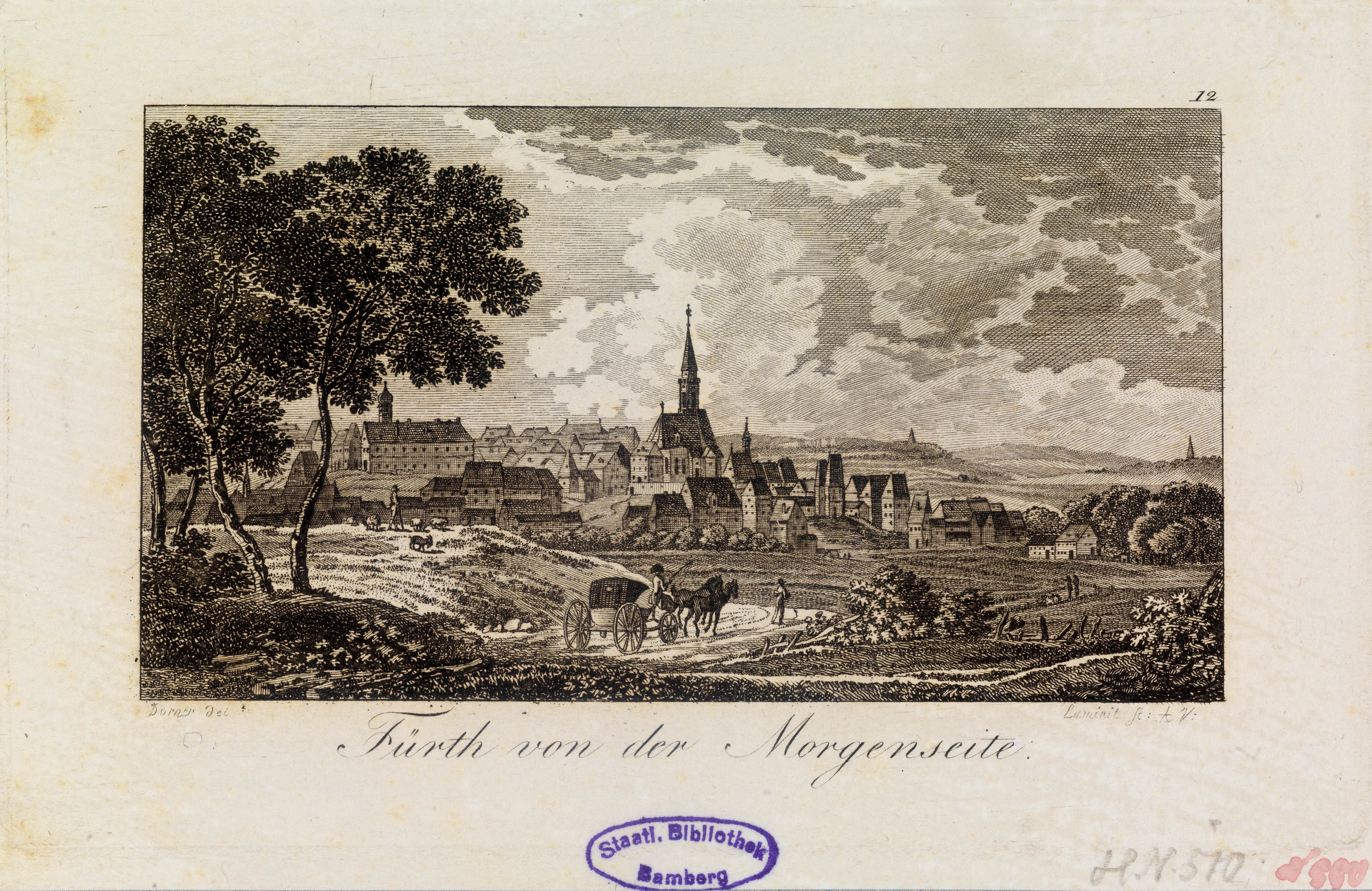 | Beschreibung | "Fürth von der Morgenseite". Kupferstich von Laminit nach Dorner, um 1810/1811 | ||