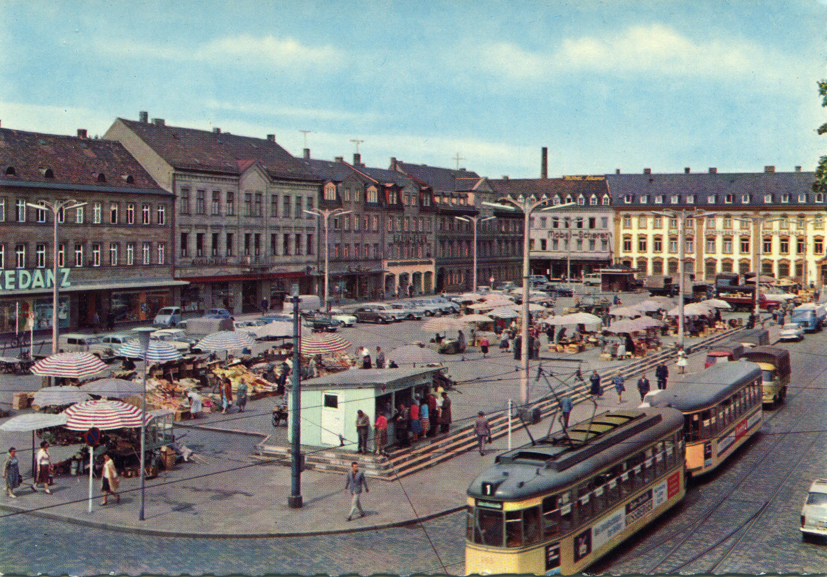 | Beschreibung | Fürther Freiheit um 1970 mit Wochenmarkt und Straßenbahn, Treppen noch mit Luftschutzfarbe versehen | ||