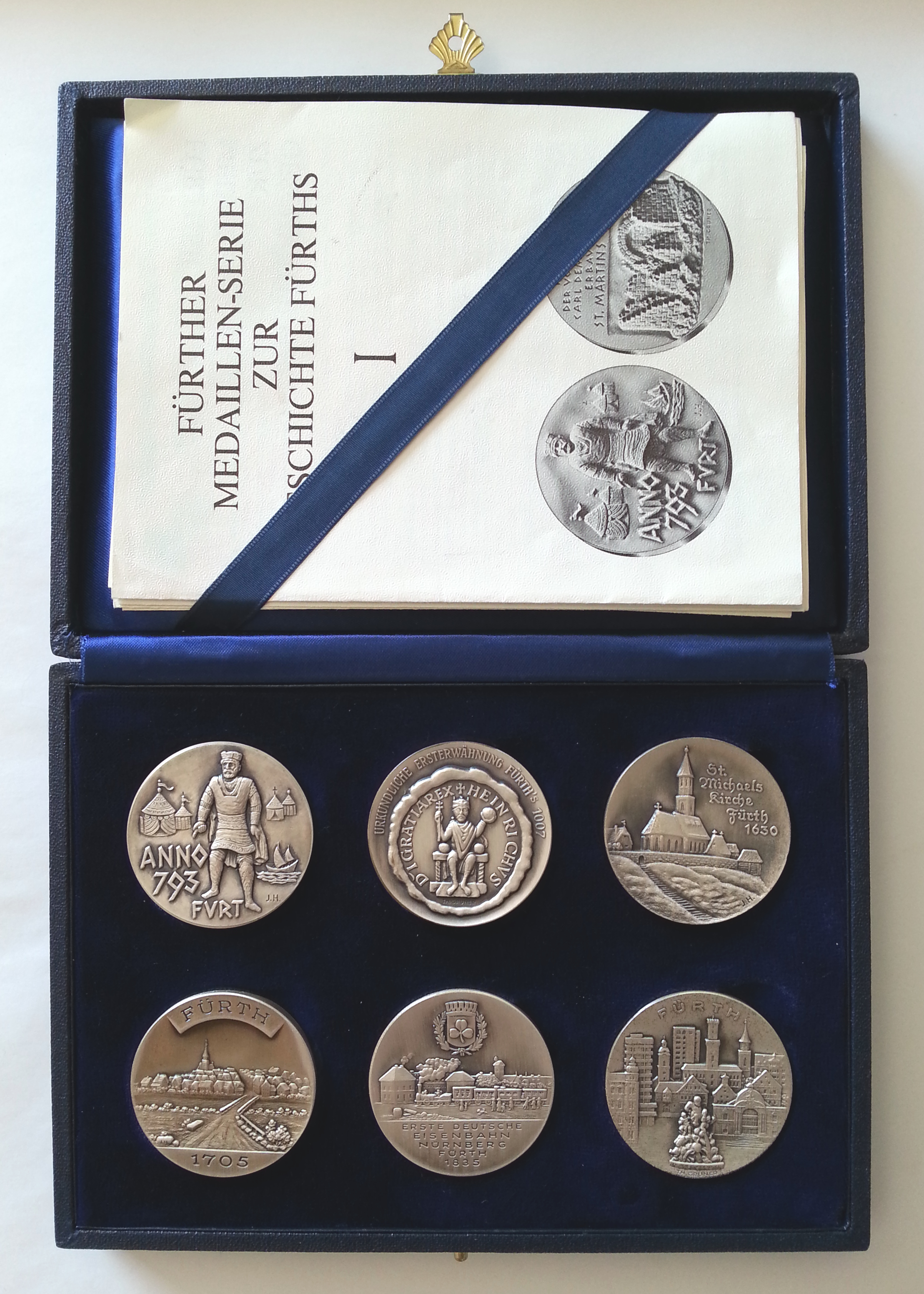 | Beschreibung | Komplettset der Medaillen-Serie zur Geschichte Fürths in silber mit blauem Samtetui | ||
