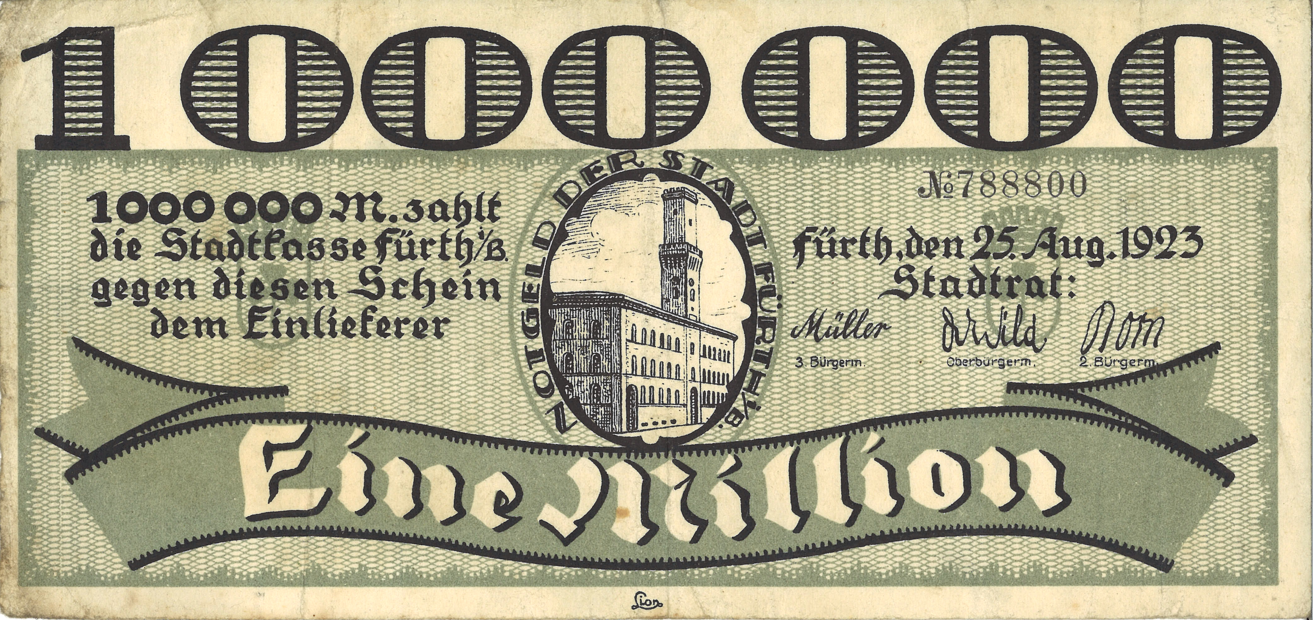 | Dateiinfo (Bild-Unterschrift und Info-Box, automatisch erstellt) | Fürther Notgeld 1923, 1.000.000 Mark, Motiv Rathaus Lizenz: CC BY-SA 3.0 | ||