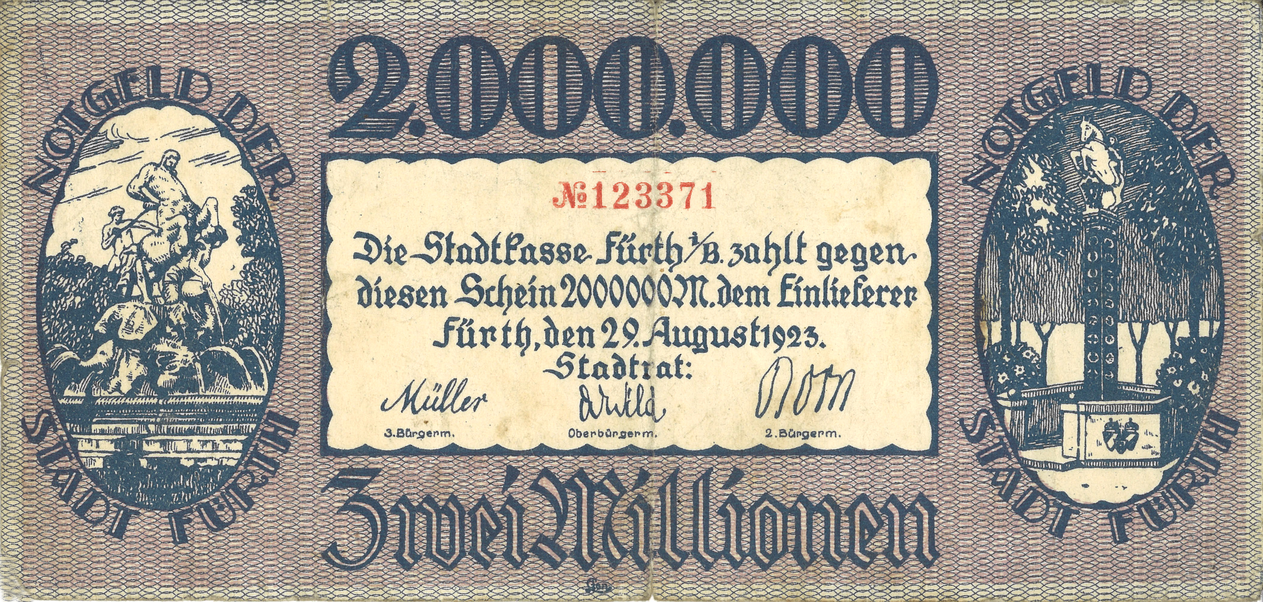 | Dateiinfo (Bild-Unterschrift und Info-Box, automatisch erstellt) | Fürther Notgeld 1923, 2.000.000 Mark, Motiv Centaurenbrunnen und Nagelsäule Lizenz: CC BY-SA 3.0 | ||