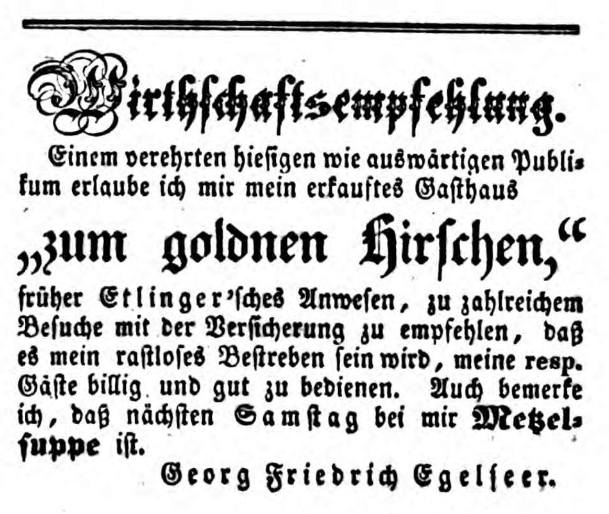 | Beschreibung | Anzeige über den Erwerb des Gasthauses "Zum Goldnen Hirschen" durch Georg Friedrich Egelseer, 1851 | ||