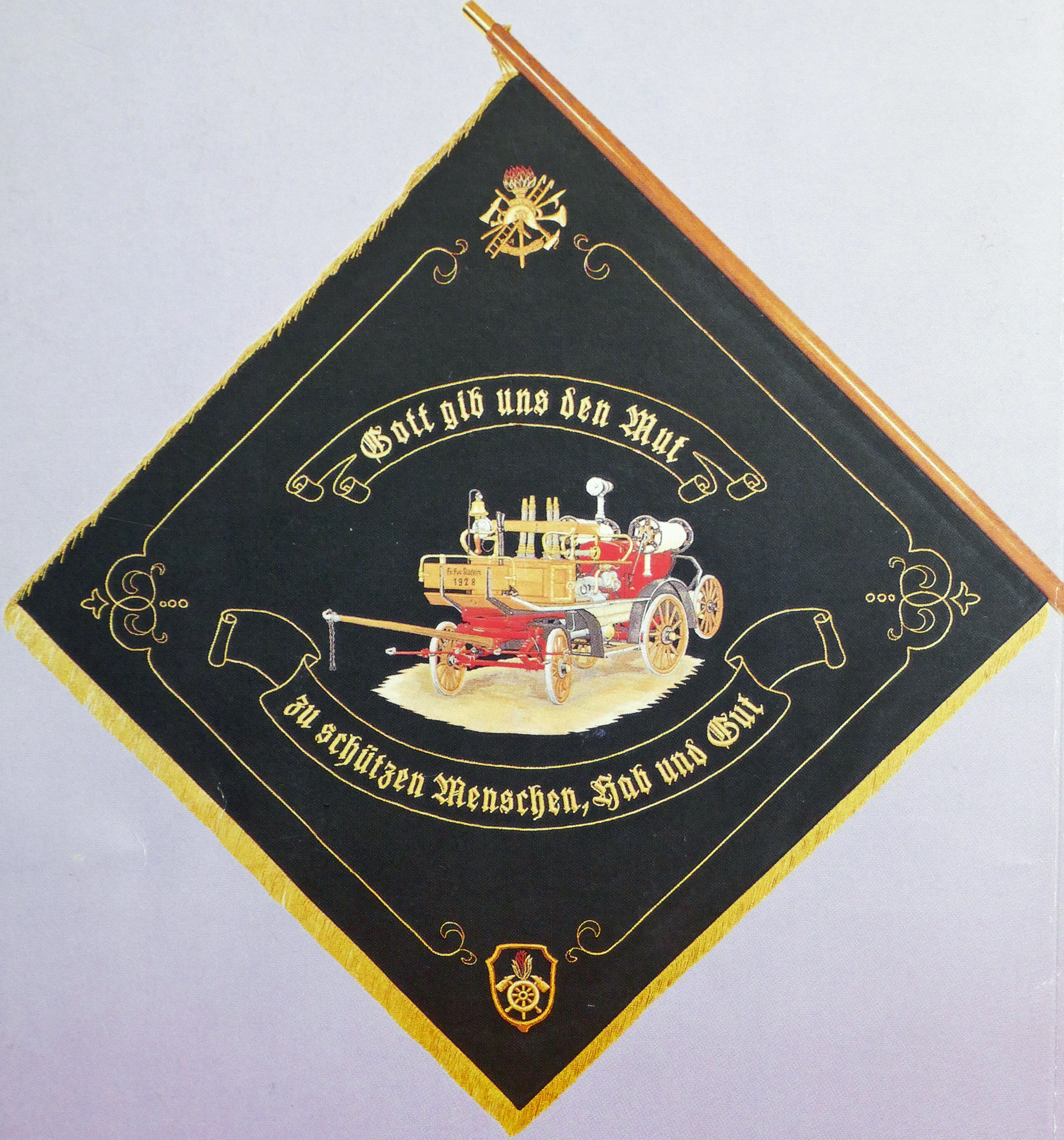 | Beschreibung | Motorspritze "Magirus Trossingen" von 1928 auf der Fahne der FFW Fürth-Stadeln | ||