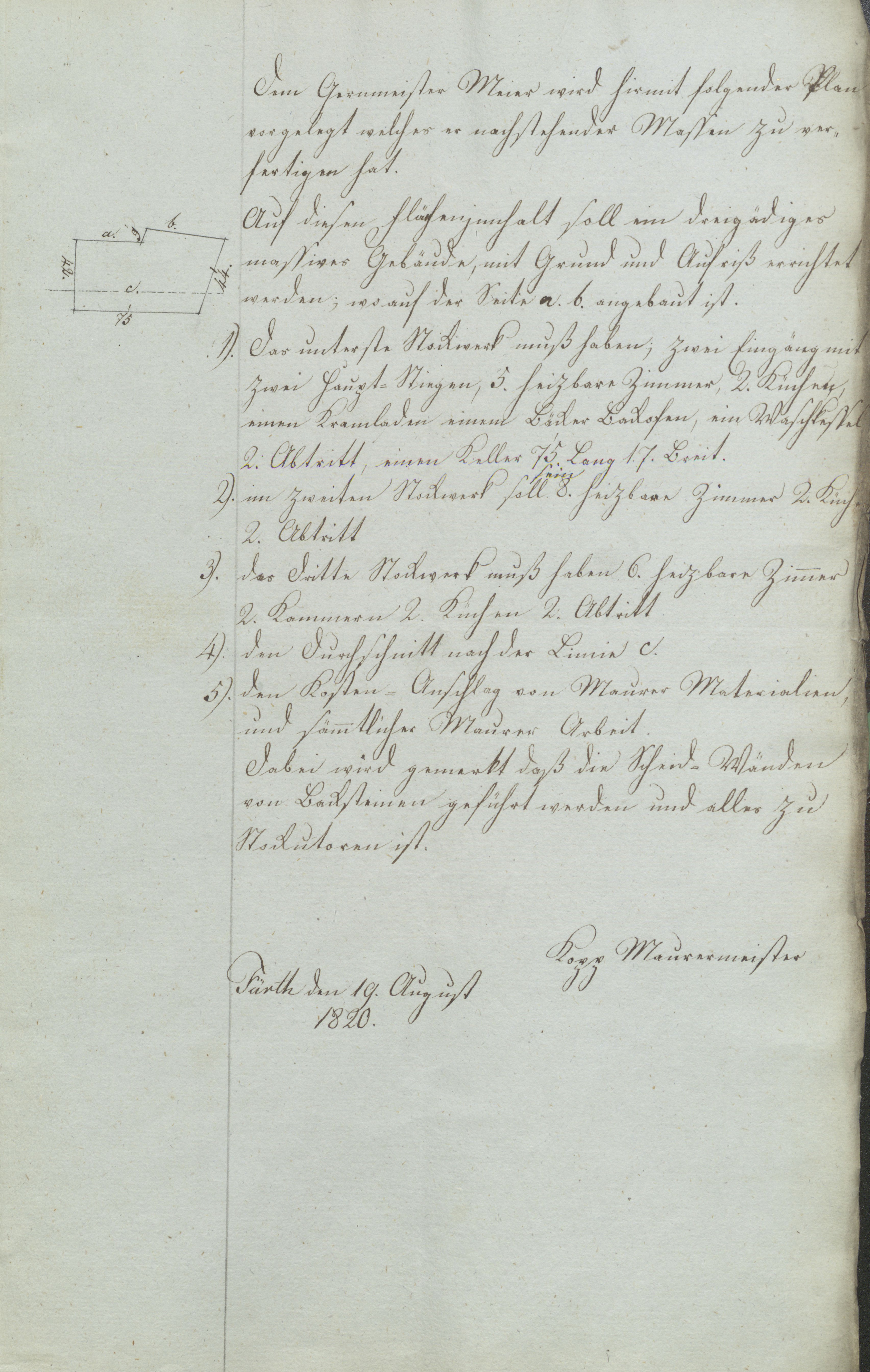 | Beschreibung | Aufgabe für das Meisterstück des Gernmeisters Wilhelm Meyer, gestellt von Maurermeister Friedrich Kopp | ||