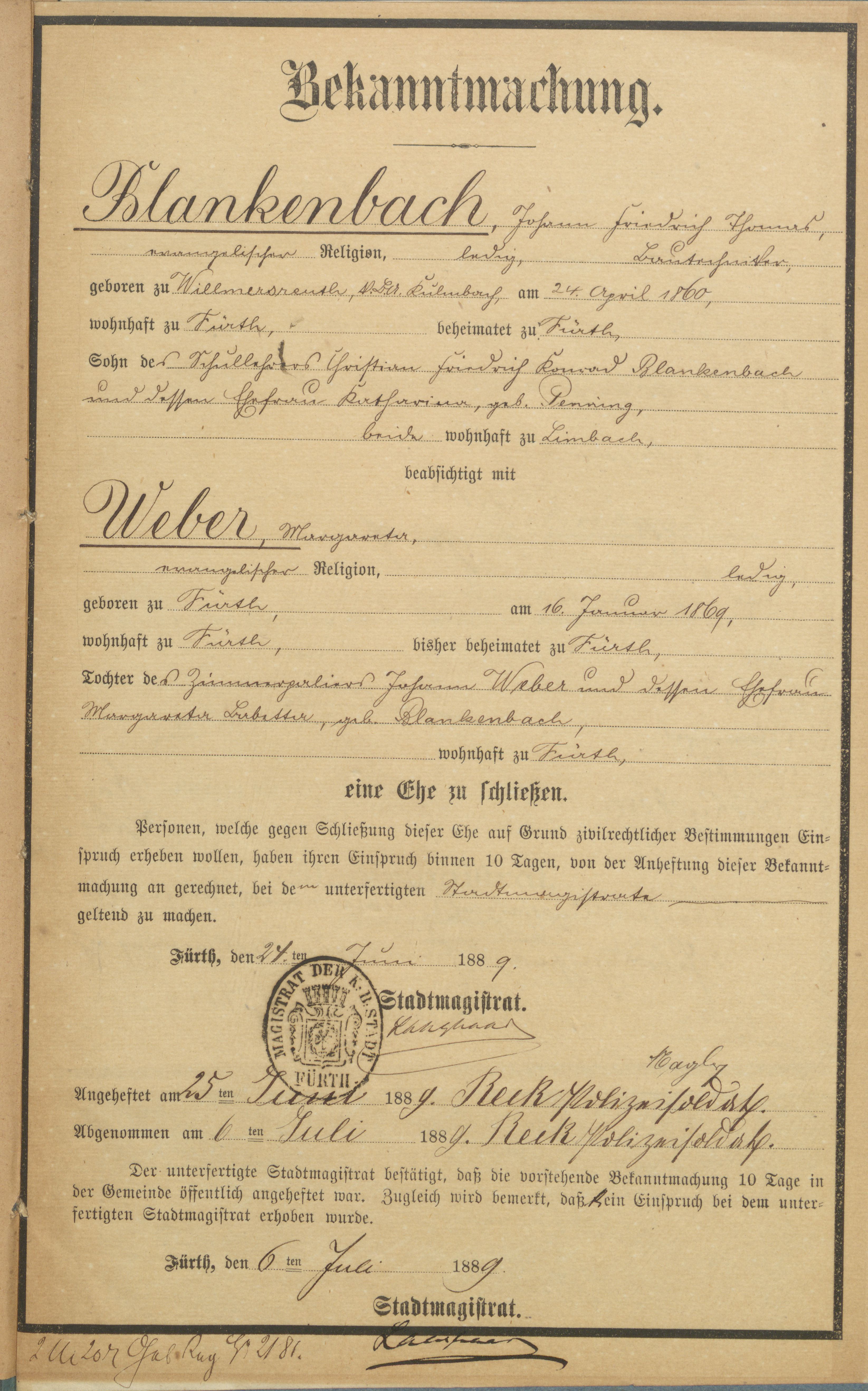 | Beschreibung | Bekanntmachung zur Eheschließung Blankenbach/Weber, Juni 1889 | ||