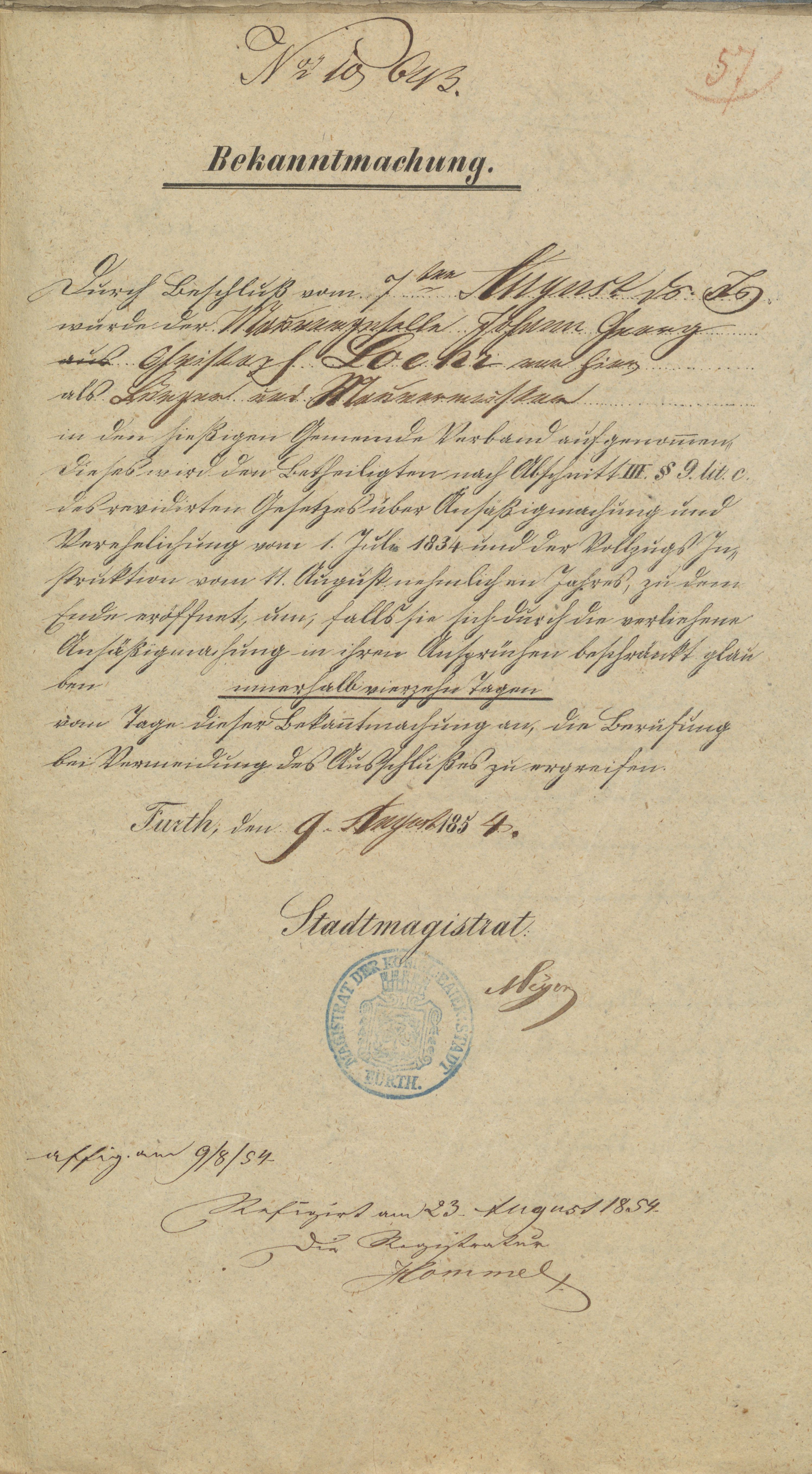 | Dateiinfo (Bild-Unterschrift und Info-Box, automatisch erstellt) | Bekanntmachung über die Aufnahme von J. G. C. Loehr als Bürger und Maurermeister vom 9. August 1854 Lizenz: Bildlizenz-Stadtarchiv | ||